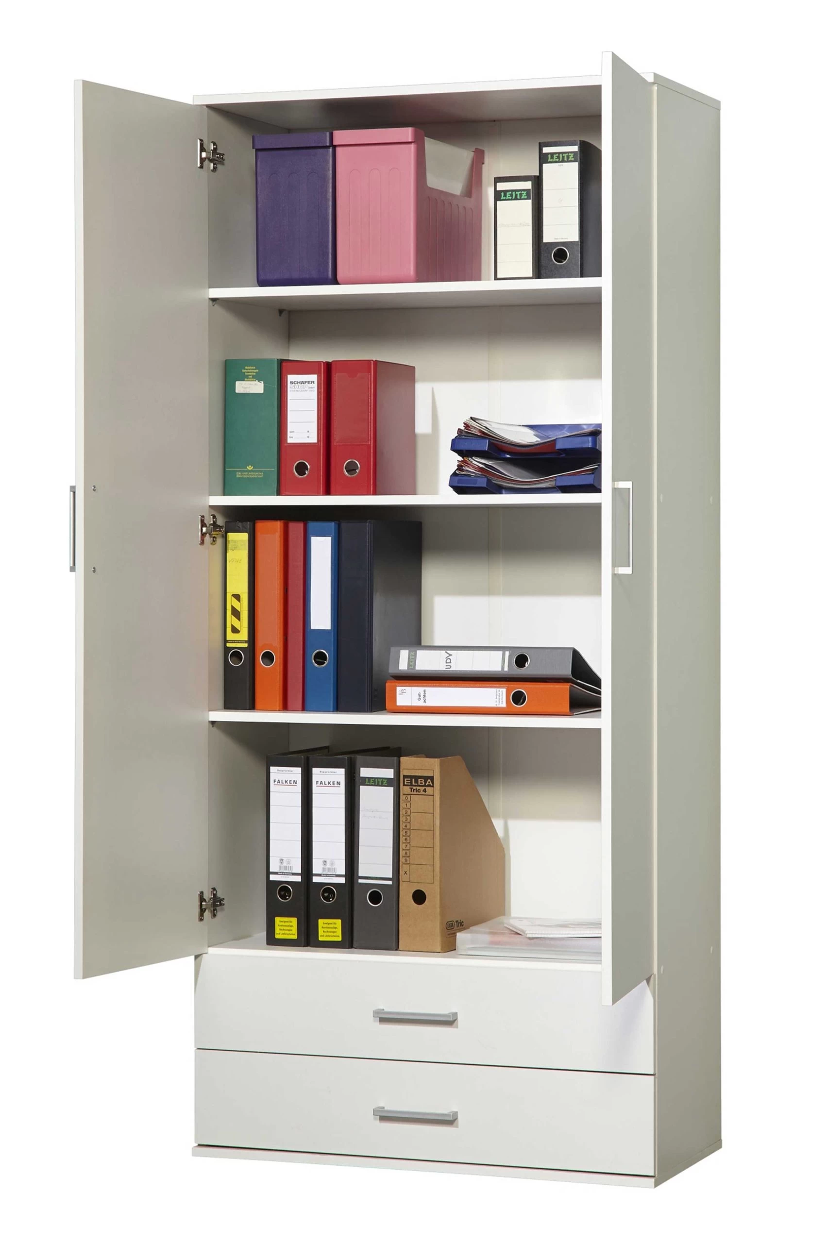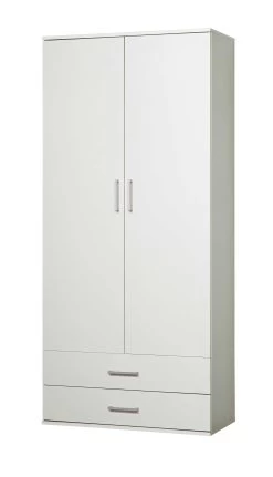 Witte 2-deurskast Ronny met 2 deuren en 2 laden, gemaakt van spaanplaat.