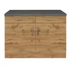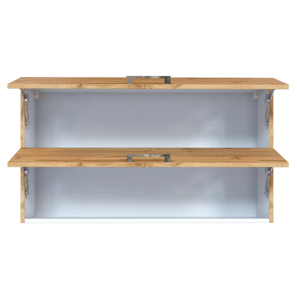 Keukenhangkast Sorrella 100x34x57cm uit spaanplaat met metalen handgrepen. Afgewerkt met melamine in eikdecor. Met twee opklapdeuren.ย