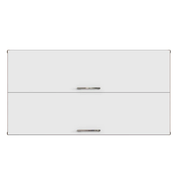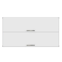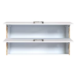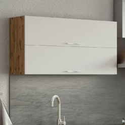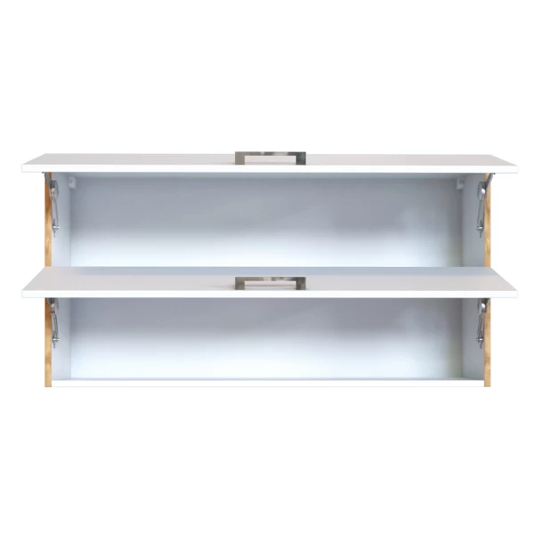 Keukenhangkast Sorrella 110x34x57cm uit spaanplaat met metalen handgrepen. Afgewerkt met melamine in eikdecor en wit. Met twee opklapdeuren.ย
