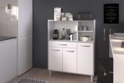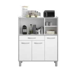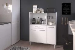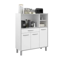Keukenkast Easy vormt het antwoord op jouw opbergproblemen in de keuken. Deze ruime kast beschikt over heel veel opbergruimte dankzij deย drie deurenย enย รฉรฉn lade. De compartimenten achter de deuren zijn voorzien vanย tweeย legplanken. Daarnaast is deze keukenkast ook uitgerust metย drie open compartimenten. De volledige kast is gemaakt uitย spaanplaatย met eenย witgelakte afwerking.