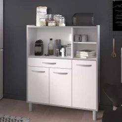 Keukenkast Easy vormt het antwoord op jouw opbergproblemen in de keuken. Deze ruime kast beschikt over heel veel opbergruimte dankzij deย drie deurenย enย รฉรฉn lade. De compartimenten achter de deuren zijn voorzien vanย tweeย legplanken. Daarnaast is deze keukenkast ook uitgerust metย drie open compartimenten. De volledige kast is gemaakt uitย spaanplaatย met eenย witgelakte afwerking.