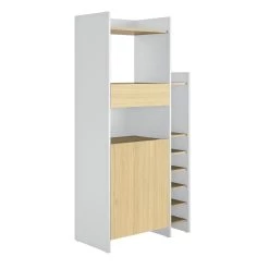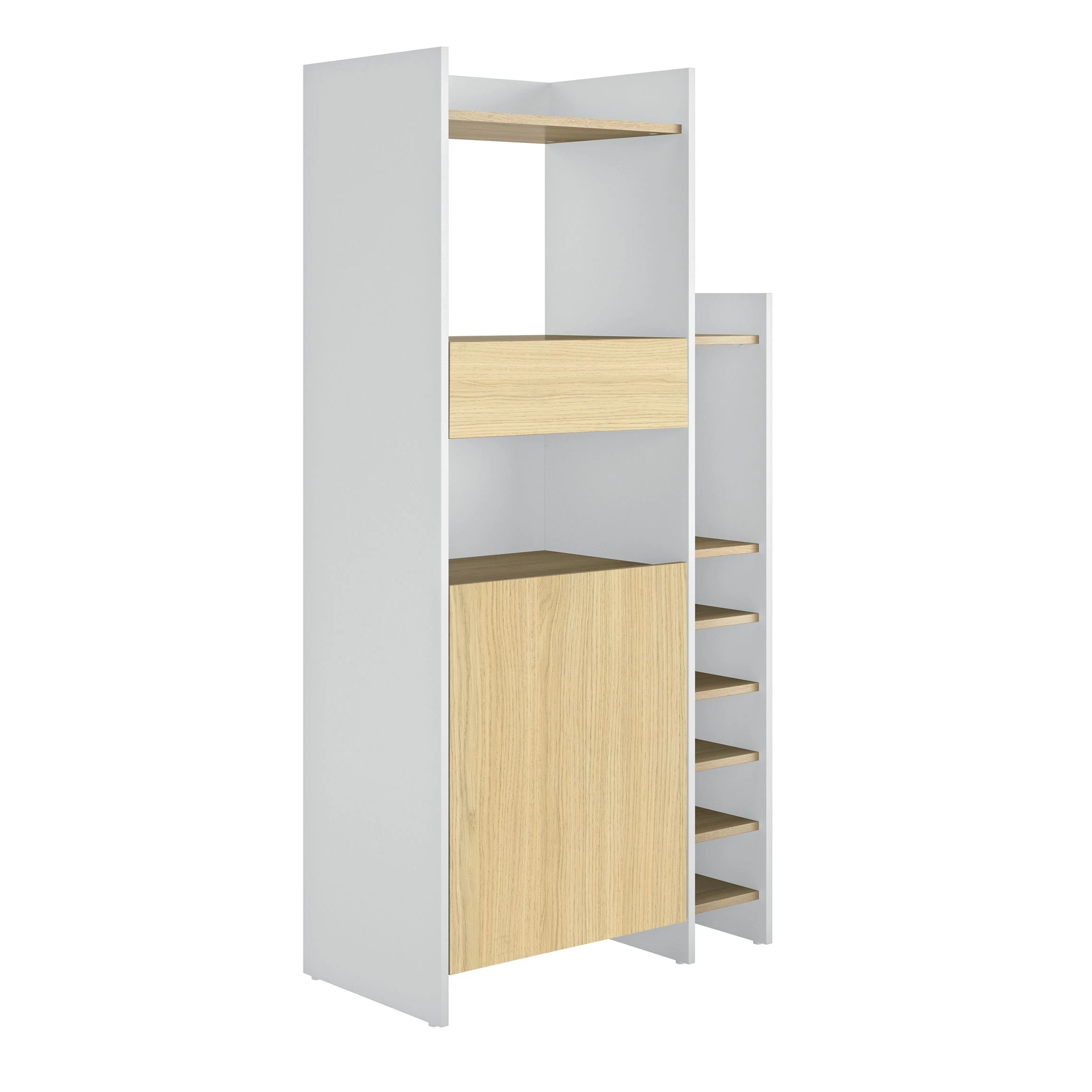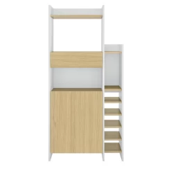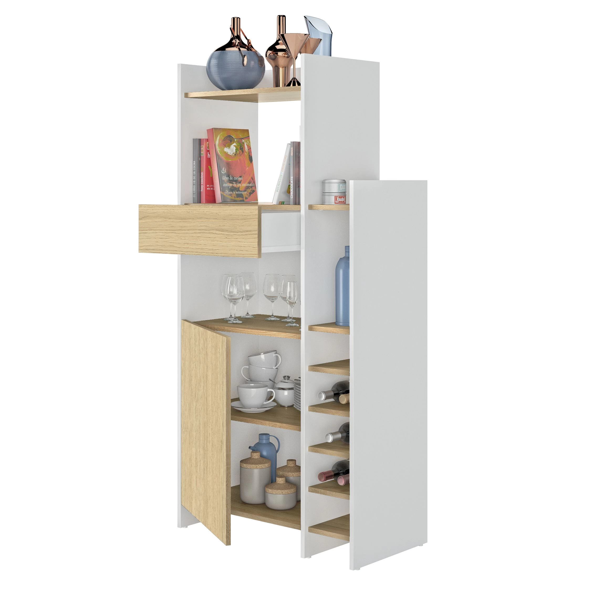 Deze keukenkast biedt de perfecte symbiose tussen nut en esthetiek, tussen opbergplaats en elegante look. Deze opbergkast kan je eenvoudig in je keuken of eetkamer integreren, zodat je kookboeken, mooiste glazen of enkele flessen wijn netjes opgeborgen kunnen worden. Dit meubel is gemaakt uit witte, gemelamineerde spaanplaat met fronten in lichte eikdecor en is uitgerust met 1 lade en 1 deur. In het meubel beschik je over zowel grote als minder grote opbergvakjes, op maat van elk accessoire of object.