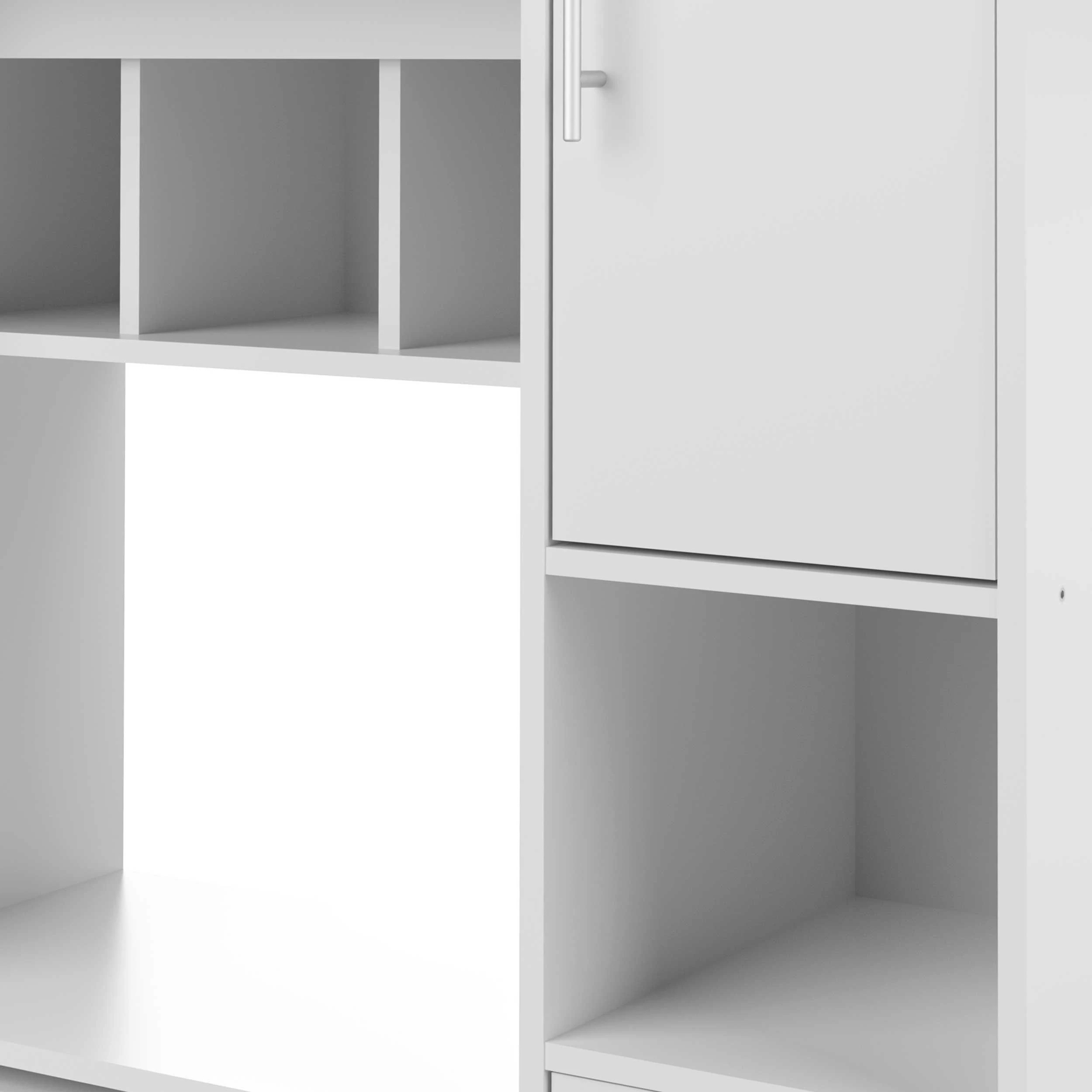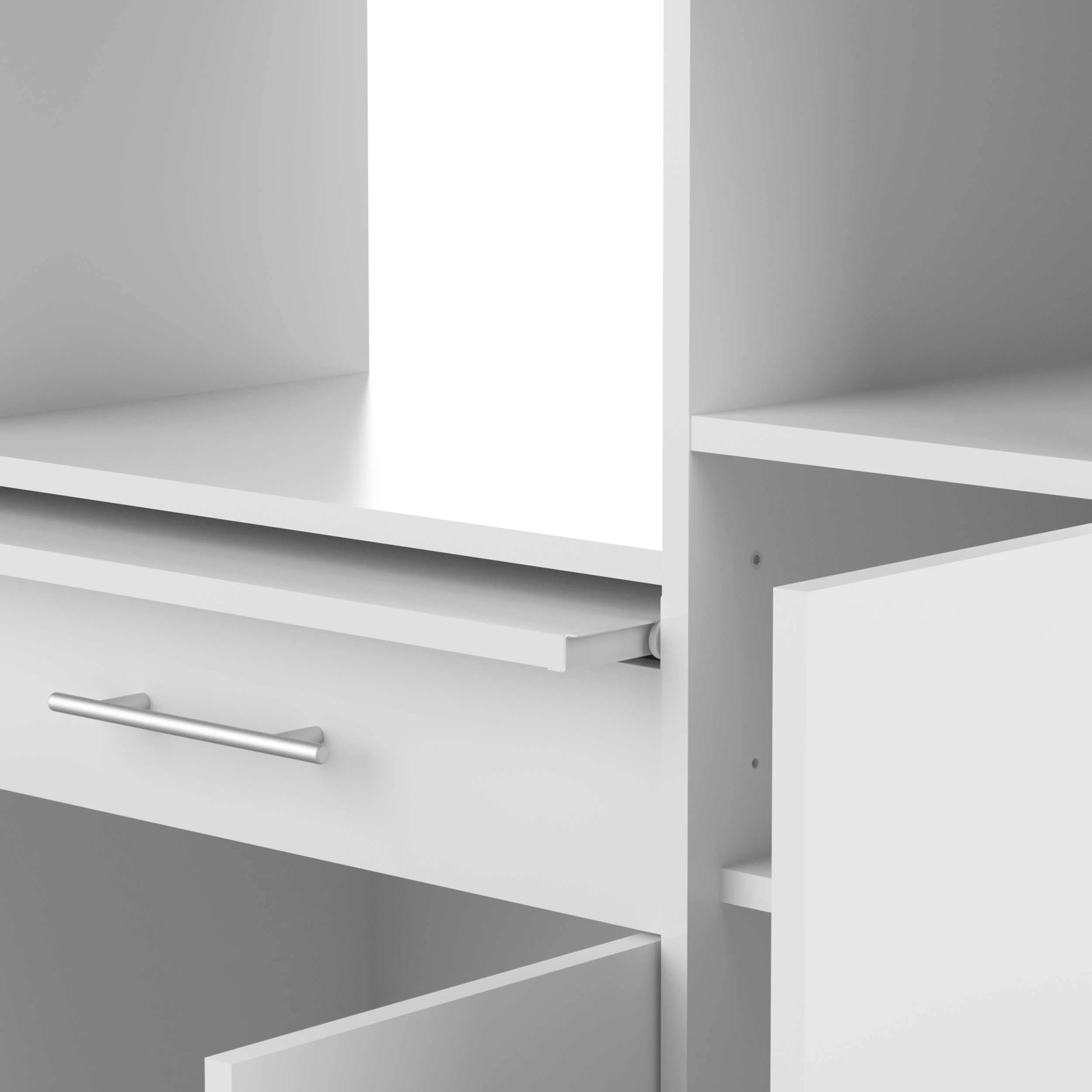 De kast beschikt in totaal over 6 deuren, een lade, 5 open vakken met verschillende afmetingen en een uitschuifbare legplank onder het grote open vak. Keukenkast Liana is gemaakt van spaanplaat. Deze versie is helemaal wit. Je vindt op onze site ook andere kleurencombinaties.ย