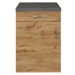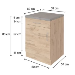 Keukenkast Sorrella 50x60x85cm uit spaanplaat met met metalen handgrepen. Afgewerkt met melamine in eikdecor. Met 1 deur en 1 lade.ย