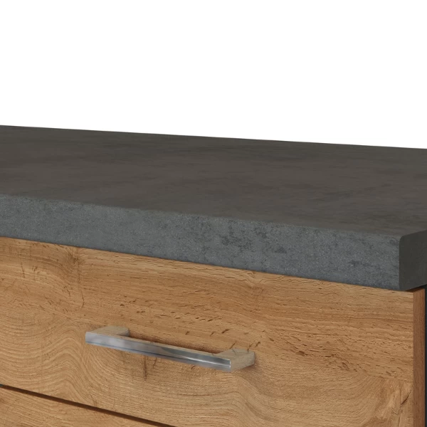 De keuken is het hart van het huis. Het is dus belangrijk om keukenkasten te kiezen die volledig aan je wensen voldoen. Deze kast is gemaakt uit spaanplaat, afgewerkt met melamine inย eikdecor. Deย metalen handgrepenย zijn een leuk detail. Achter de deur is eenย legplankย voorzien, waardoor je opbergruimte creรซert voor al je potten en pannen. Deย ladeย is dan weer handig om kleinere zaken of bestek in op te bergen. Het werkblad is gemaakt uitย duurzaam HPL. De collectie Sorrella bestaat in verschillende uitvoeringen. Stel zelf je droomkeuken samen.ย