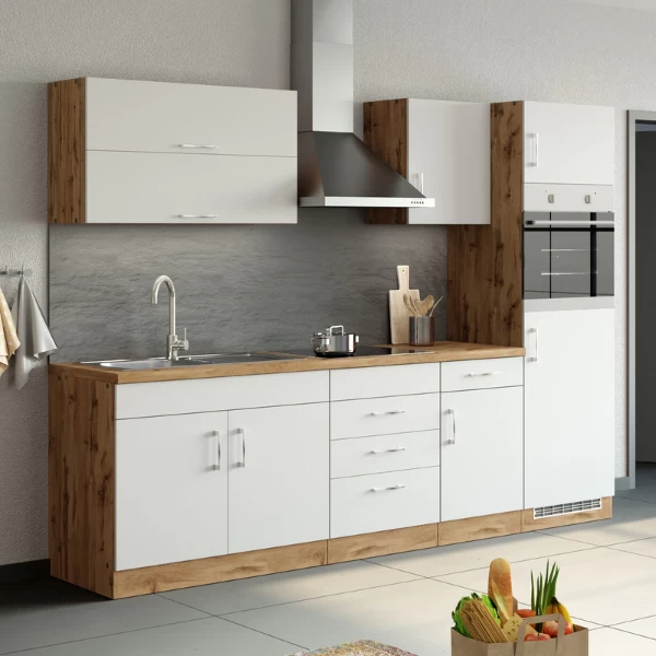 De keuken is het hart van het huis. Het is dus belangrijk om keukenkasten te kiezen die volledig aan je wensen voldoen. Deze kast is gemaakt uit spaanplaat, afgewerkt met melamine inย witย enย eikdecor. Deย metalen handgrepenย zijn een leuk detail. Achter de deur is eenย legplankย voorzien, waardoor je opbergruimte creรซert voor al je potten en pannen. Deย ladeย is dan weer handig om kleinere zaken of bestek in op te bergen. Het werkblad is gemaakt uitย duurzaam HPL. De collectie Sorrella bestaat in verschillende uitvoeringen. Stel zelf je droomkeuken samen.ย