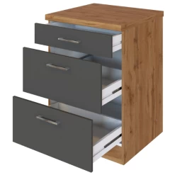 Keukenkast Sorrella 50x60x85cm uit spaanplaat met metalen handgrepen. Afgewerkt met melamine in eikdecor en antraciet. Met 3 lades.