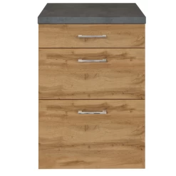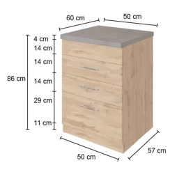 Keukenkast Sorrella 50x60x85cm uit spaanplaat met metalen handgrepen. Afgewerkt met melamine in eikdecor. Met 3 lades.