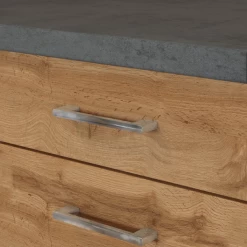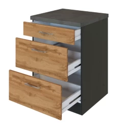 Keukenkast Sorrella 50x60x85cm uit spaanplaat met metalen handgrepen. Afgewerkt met melamine in eikdecor en grafiet. Met 3 lades.
