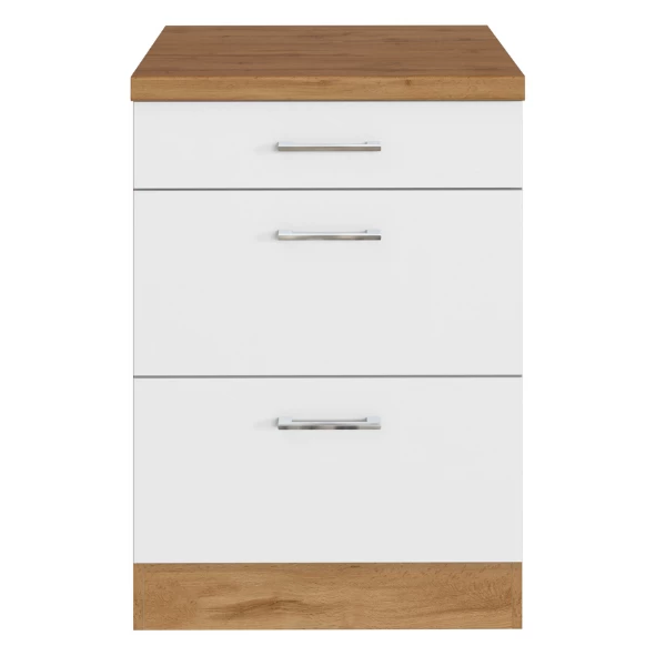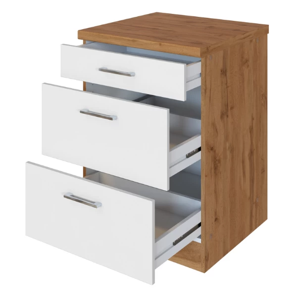 Keukenkast Sorrella 50x60x85cm uit spaanplaat met metalen handgrepen. Afgewerkt met melamine in eikdecor en wit. Met 3 lades.
