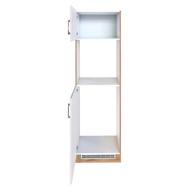 Keukenkast Sorrella 60x60x200cm uit spaanplaat met metalen handgrepen. Afgewerkt met melamine in eikdecor en wit. Met 2 deuren. Geschikt voor koelkast en oven/microgolfoven. Keukentoestellen niet inbegrepen.