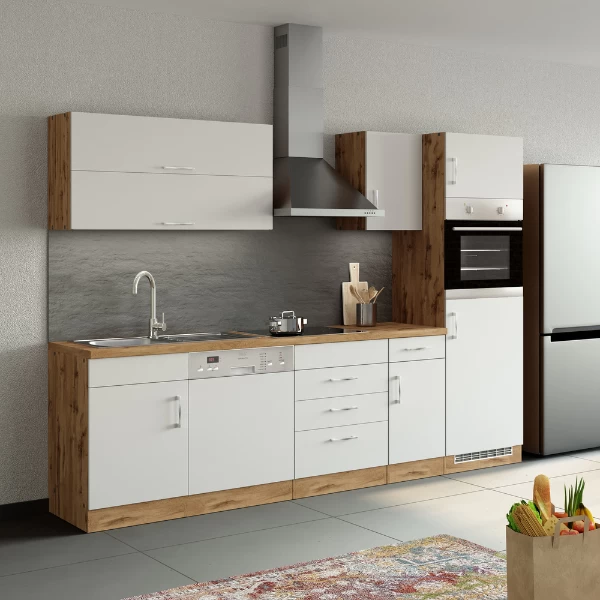 De keuken is het hart van het huis. Het is dus belangrijk om keukenkasten te kiezen die volledig aan je wensen voldoen. Deze keukenkast is gemaakt uit spaanplaat, afgewerkt met melamine in wit en eikdecor. De metalen handgrepen zijn een leuk detail. Achter de onderste deur is er ruimte voorzien voor een koelkast. De nis in het midden biedt ruimte voor een oven of magnetron. De toestellen zelf zijn niet inbegrepen. Achter de bovenste deur is er nog handige opbergruimte voorzien. De deuren kunnen zowel links als rechts gemonteerd worden. De collectie Sorrella bestaat in verschillende uitvoeringen. Stel zelf je droomkeuken samen.