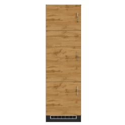 Keukenkast Sorrella 60x60x200cm uit spaanplaat met metalen handgrepen. Afgewerkt met melamine in eikdecor en grafiet. Met 3 deuren en 1 legplank. Geschikt voor koelkast. Keukentoestellen niet inbegrepen.