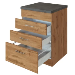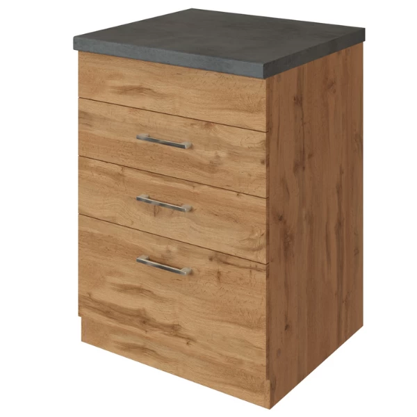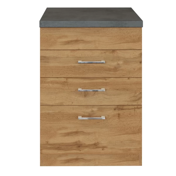 Keukenkast Sorrella 60x60x85cm uit spaanplaat met metalen handgrepen.ย Afgewerkt met melamine in eikdecor. Met 3 lades. Geschikt voor kookplaat. Keukentoestellen niet inbegrepen.ย