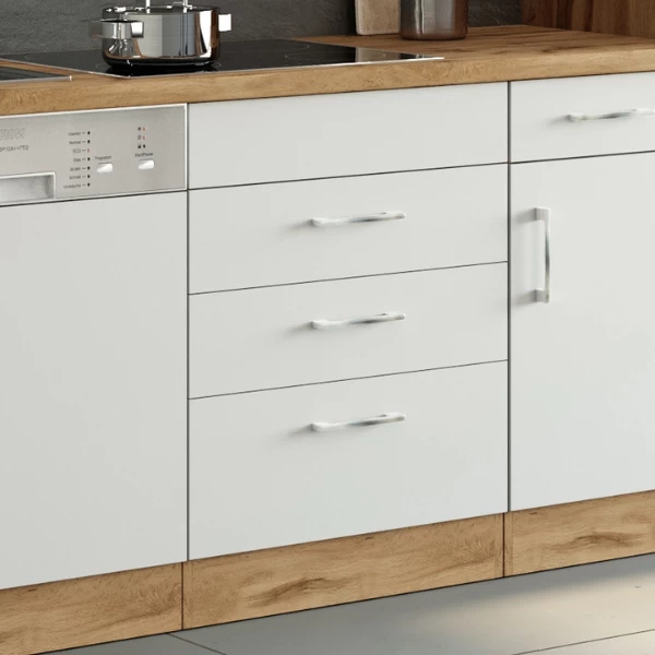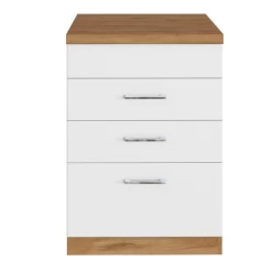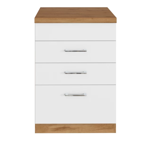 Keukenkast Sorrella 60x60x85cm uit spaanplaat met metalen handgrepen.ย Afgewerkt met melamine in eikdecor en wit. Met 3 lades. Geschikt voor kookplaat. Keukentoestellen niet inbegrepen.ย