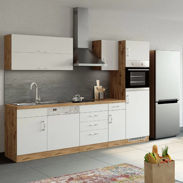 De keuken is het hart van het huis. Het is dus belangrijk om keukenkasten te kiezen die volledig aan je wensen voldoen. Deze keukenkast is gemaakt uit spaanplaat, afgewerkt met melamine inย witย enย eikdecor. Deย metalen handgrepenย zijn een leuk detail. In de kast is ruimte voorzien om eenย kookplaatย te monteren. De kookplaat zelf is niet inbegrepen. Verder is de kast voorzien vanย 3 ladesย waardoor je veel opbergruimte creรซert voor allerlei kleine keukenitems.ย De collectie Sorrella bestaat in verschillende uitvoeringen. Stel zelf je droomkeuken samen.ย
