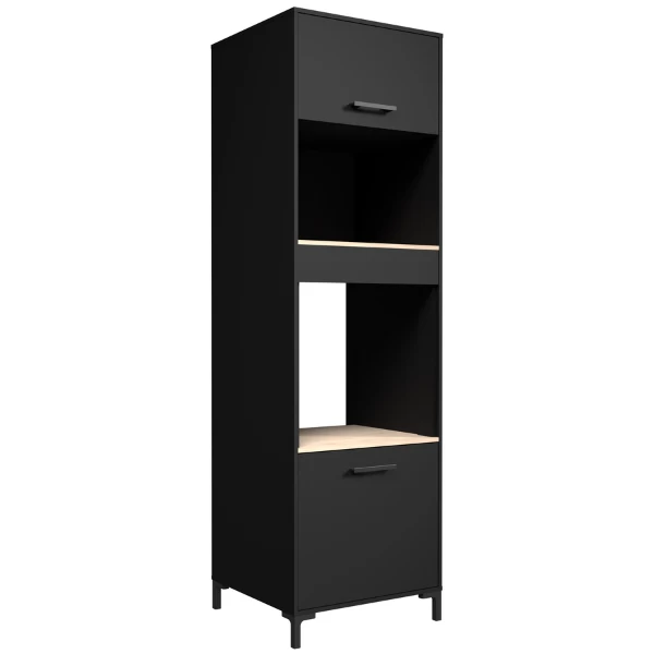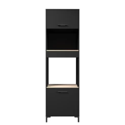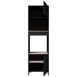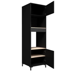 Keukenkast voor oven en magnetron Cobalt 63x59x213cm uit spaanplaat met afwerking in zwart en eikdecor. Voorzien van twee deuren en een legplank.