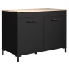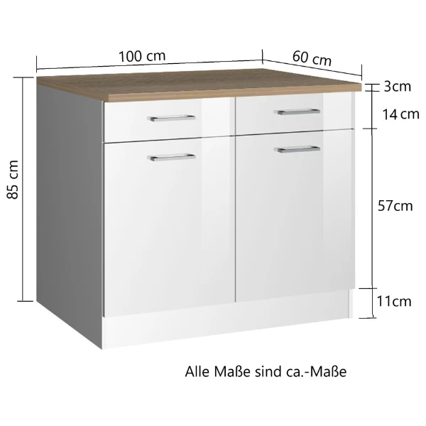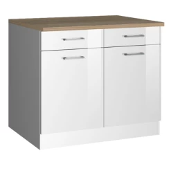 Keukenonderkast Ragnar 100x60x85cm uit MDF met afwerking in hoogglans wit en eikdecor. Met twee lades en metalen handgrepen.