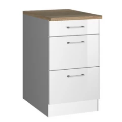 Keukenonderkast Ragnar 50x60x85cm uit MDF met afwerking in hoogglans wit en eikdecor. Met drie lades met metalen handgrepen.