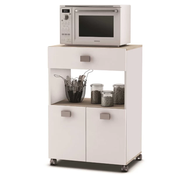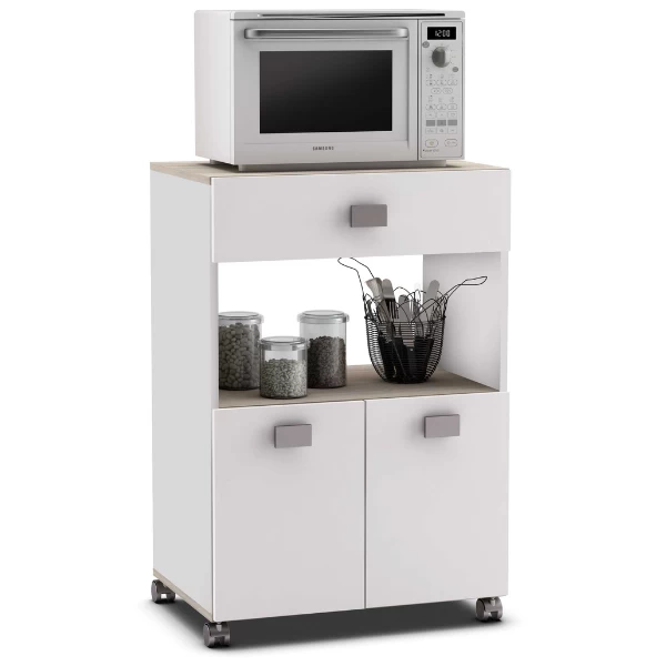 Deze neutrale keukentrolley heeft een speels kantje door zijn rechthoekige handgrepen. Het beschikt over een lade voor uw bestek en 2 draaideuren met daarachter ruimte voor potten en pannen, borden, glazen of voorraad. In het open vak is nog plaats voor kruiden en olijfolie of keukengerei. Op het werkblad kunt u een microgolfoven plaatsen. Het kastje kan gemakkelijk verplaatst worden naar gelijk welke plek waar u het nodig heeft door de handige wieltjes onderaan.