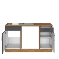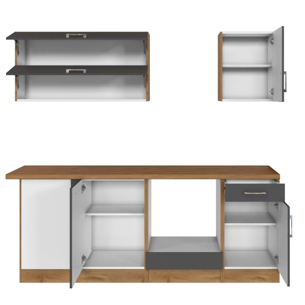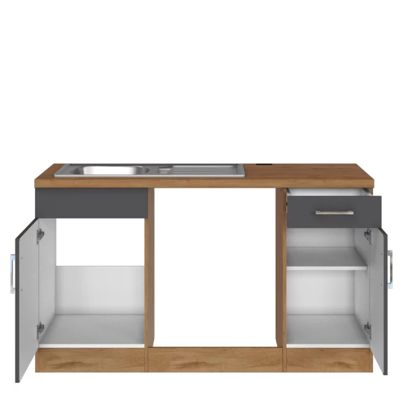 De keuken is het hart van het huis. Het is dus belangrijk om een keuken te kiezen die volledig aan je wensen voldoet. De kasten zijn gemaakt uit spaanplaat, afgewerkt met melamine inย antracietย enย eikdecor. Deย metalen handgrepenย zijn een leuk detail. Deze opstelling bestaat uit twee hangkasten, een gootsteenonderkast metย roestvrijstalen spoelbak en ruimte voor een vaatwasmachine, een onderkast met opberglade, een hoekonderkast met รฉรฉn deur, een onderkast metย ruimte voor oven en kookplaatย en een onderkast met drie lades. De toestellen zijn niet inbegrepen.ย De collectie Sorrella bestaat in verschillende uitvoeringen. Zo vind je zeker jouw ideale keuken.