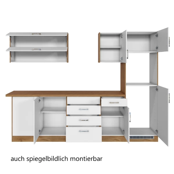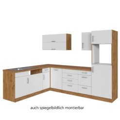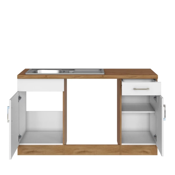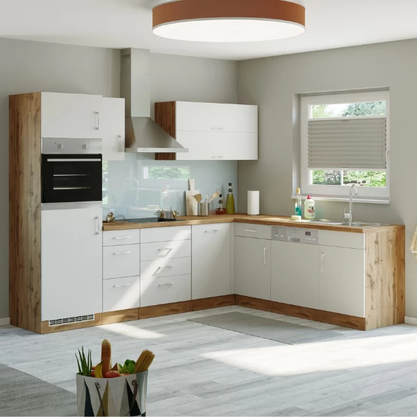 De keuken is het hart van het huis. Het is dus belangrijk om een keuken te kiezen die volledig aan je wensen voldoet. De kasten zijn gemaakt uit spaanplaat, afgewerkt met melamine inย witย enย eikdecor. Deย metalen handgrepenย zijn een leuk detail. Deze opstelling bestaat uit twee hangkasten, een gootsteenonderkast metย roestvrijstalen spoelbakย enย ruimte voor een vaatwasmachine, een onderkast met opberglade, een hoekonderkast met รฉรฉn deur, een onderkast met drie lades enย ruimte voor een kookplaat,ย een onderkast met drie lades en een kast metย ruimte voor een koelkast en oven. De toestellen zijn niet inbegrepen.ย De collectie Sorrella bestaat in verschillende uitvoeringen. Zo vind je zeker jouw ideale keuken.