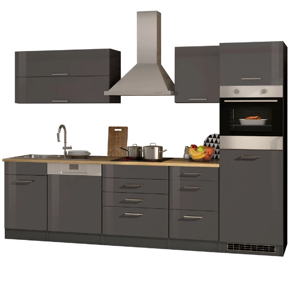 De keuken is รฉรฉn van de belangrijkste ruimtes in je huis. Daarom is het belangrijk om een keuken samen te stellen die qua stijl en functie volledig bij jou past. De keukenkasten Ragnar zijn gemaakt uit MDF. De afwerking inย hoogglans antracietย en deย metalen handgrepenย zorgen voor een moderne look. Deze opstelling bestaat uit twee hangkasten, eenย gootsteenkastย metย een vaatwasmachine, een onderkast met drie lades enย een kookplaat,ย een dampkap, een onderkast met drie opberglades en een keukenkast metย een oven. De collectie Ragnar bestaat ook in hoogglans wit.