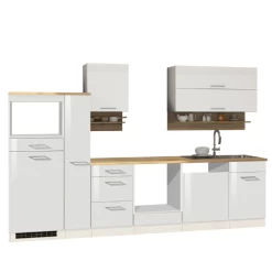De keuken is รฉรฉn van de belangrijkste ruimtes in je huis. Daarom is het belangrijk om een keuken samen te stellen die qua stijl en functie volledig bij jou past. De keukenkasten Ragnar zijn gemaakt uit MDF. De afwerking inย hoogglans witย en deย metalen handgrepenย zorgen voor een moderne look. Deze opstelling bestaat uit twee hangkasten met wandplank, eenย gootsteenkast met ruimte voor een vaatwasser, een onderkast metย ruimte voor een kookplaat en oven,ย een onderkast met drie opberglades, een apothekerskast en een kast metย ruimte voor een magnetron en een koelkast. De toestellen zijn niet inbegrepen. De collectie Ragnar bestaat ook in hoogglans antraciet.