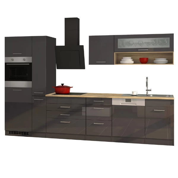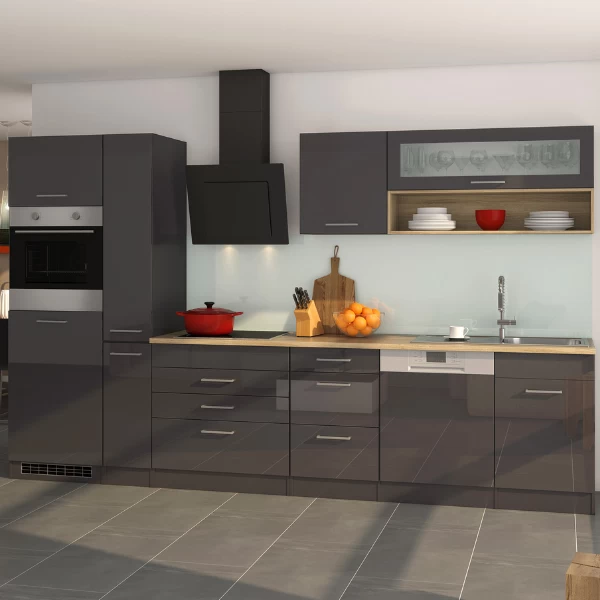 De keuken is รฉรฉn van de belangrijkste ruimtes in je huis. Daarom is het belangrijk om een keuken samen te stellen die qua stijl en functie volledig bij jou past. De keukenkasten Ragnar zijn gemaakt uit MDF. De afwerking inย hoogglans antracietย en deย metalen handgrepenย zorgen voor een moderne look. Deze opstelling bestaat uit twee hangkasten met wandrek,ย ย eenย gootsteenkast met een vaatwas,ย een onderkast met drie lades,ย een dampkap,ย een onderkast met drie lades enย een kookplaat, een apothekerskastย en een keukenkast metย een oven en koelkast. De collectie Ragnar bestaat ook in hoogglans wit.