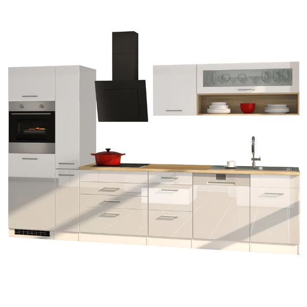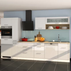 De keuken is รฉรฉn van de belangrijkste ruimtes in je huis. Daarom is het belangrijk om een keuken samen te stellen die qua stijl en functie volledig bij jou past. De keukenkasten Ragnar zijn gemaakt uit MDF. De afwerking inย hoogglans witย en deย metalen handgrepenย zorgen voor een moderne look. Deze opstelling bestaat uit twee hangkasten met wandrek,ย ย eenย gootsteenkast met een vaatwas,ย een onderkast met drie lades,ย een dampkap,ย een onderkast met drie lades enย een kookplaat,ย een apothekerskastย en een keukenkast metย een oven en koelkast. De collectie Ragnar bestaat ook in hoogglans antraciet.