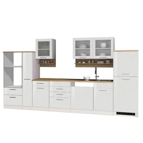 De keuken is รฉรฉn van de belangrijkste ruimtes in je huis. Daarom is het belangrijk om een keuken samen te stellen die qua stijl en functie volledig bij jou past. De keukenkasten Ragnar zijn gemaakt uit MDF. De afwerking inย hoogglans witย en deย metalen handgrepenย zorgen voor een moderne look. Deze opstelling bestaat uit drie hangkasten met wandplank, een keukenkast metย ruimte voor een oven en magnetron,ย een apothekerkast, een onderkast met opberglade, eenย gootsteenkastย metย ruimte voor een vaatwasmachine, een onderkast met drie lades enย ruimte voor een kookplaatย en een keukenkast metย ruimte voor eenย koelkast. De toestellen zijn niet inbegrepen. De collectie Ragnar bestaat ook in hoogglans antraciet.