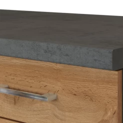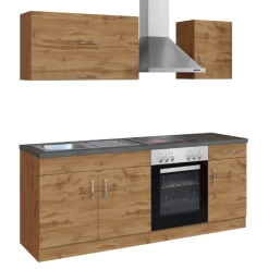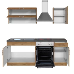 De keuken is het hart van het huis. Het is dus belangrijk om een keuken te kiezen die volledig aan je wensen voldoet. De kasten zijn gemaakt uit spaanplaat, afgewerkt met melamine inย eikdecor. Deย metalen handgrepenย zijn een leuk detail. Deze opstelling bestaat uit twee hangkasten, een gootsteenonderkast metย roestvrijstalen spoelbak, een onderkast metย ingebouwde oven en kookplaat, een afzuigkapย enย een onderkast met een opberglade. De collectie Sorrella bestaat in verschillende uitvoeringen. Zo vind je zeker jouw ideale keuken.