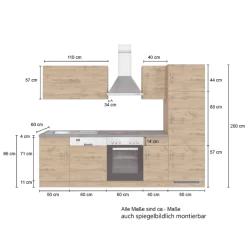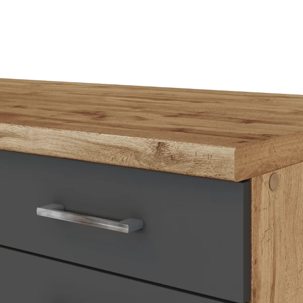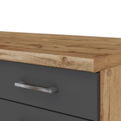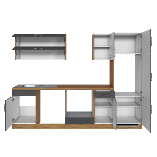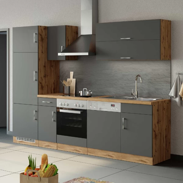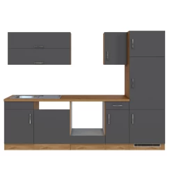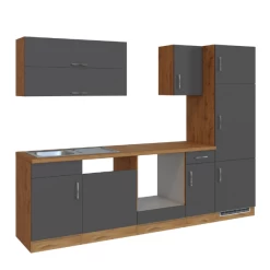 De keuken is het hart van het huis. Het is dus belangrijk om een keuken te kiezen die volledig aan je wensen voldoet. De kasten zijn gemaakt uit spaanplaat, afgewerkt met melamine inย antracietย enย eikdecor. Deย metalen handgrepenย zijn een leuk detail. Deze opstelling bestaat uit twee hangkasten, een gootsteenonderkast metย roestvrijstalen spoelbakย enย ruimte voor een vaatwasmachine, een onderkast metย ruimte voor oven en kookplaat, eenย onderkast met een opberglade en een keukenkast met ruimte voor een koelkast. De toestellen zijn niet inbegrepen.ย De collectie Sorrella bestaat in verschillende uitvoeringen. Zo vind je zeker jouw ideale keuken.