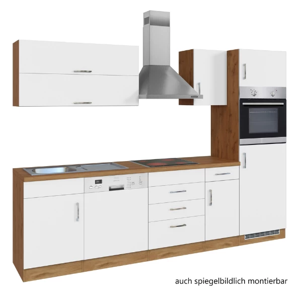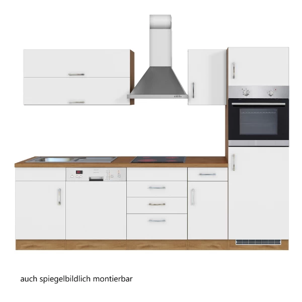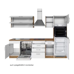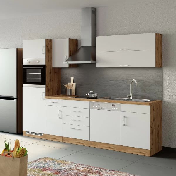 De keuken is het hart van het huis. Het is dus belangrijk om een keuken te kiezen die volledig aan je wensen voldoet. De kasten zijn gemaakt uit spaanplaat, afgewerkt met melamine inย witย enย eikdecor. Deย metalen handgrepenย zijn een leuk detail. Deze opstelling bestaat uit twee hangkasten, een gootsteenonderkast metย roestvrijstalen spoelbakย enย een vaatwasmachine, een onderkast met drie lades enย voor kookplaat, een damkap,ย eenย onderkast met een opberglade en een keukenkast metย een oven en koelkast. De collectie Sorrella bestaat in verschillende uitvoeringen. Zo vind je zeker jouw ideale keuken.