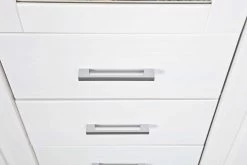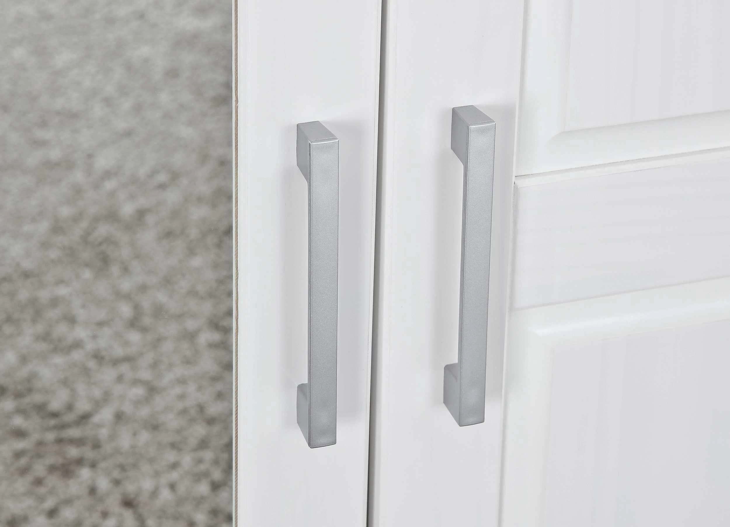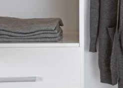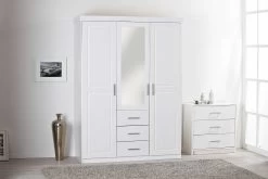 Kledingkast Geraldo is de perfecte kledingkast voor hem en voor haar. Die kledingroede hoeven jullie vanaf nu niet meer te delen, achter de linkse en rechte deur vinden jullie namelijk een identieke indeling en dus evenveel plaats voor jullie kleren. Naast een roede beschik je elk nog over een legplank bovenaan. Enkel de middelste deur kan nog voor discussie zorgen met 3 compartimenten. De deur is uitgerust met een handige spiegel. Eronder vind je nog eens 3 laden.