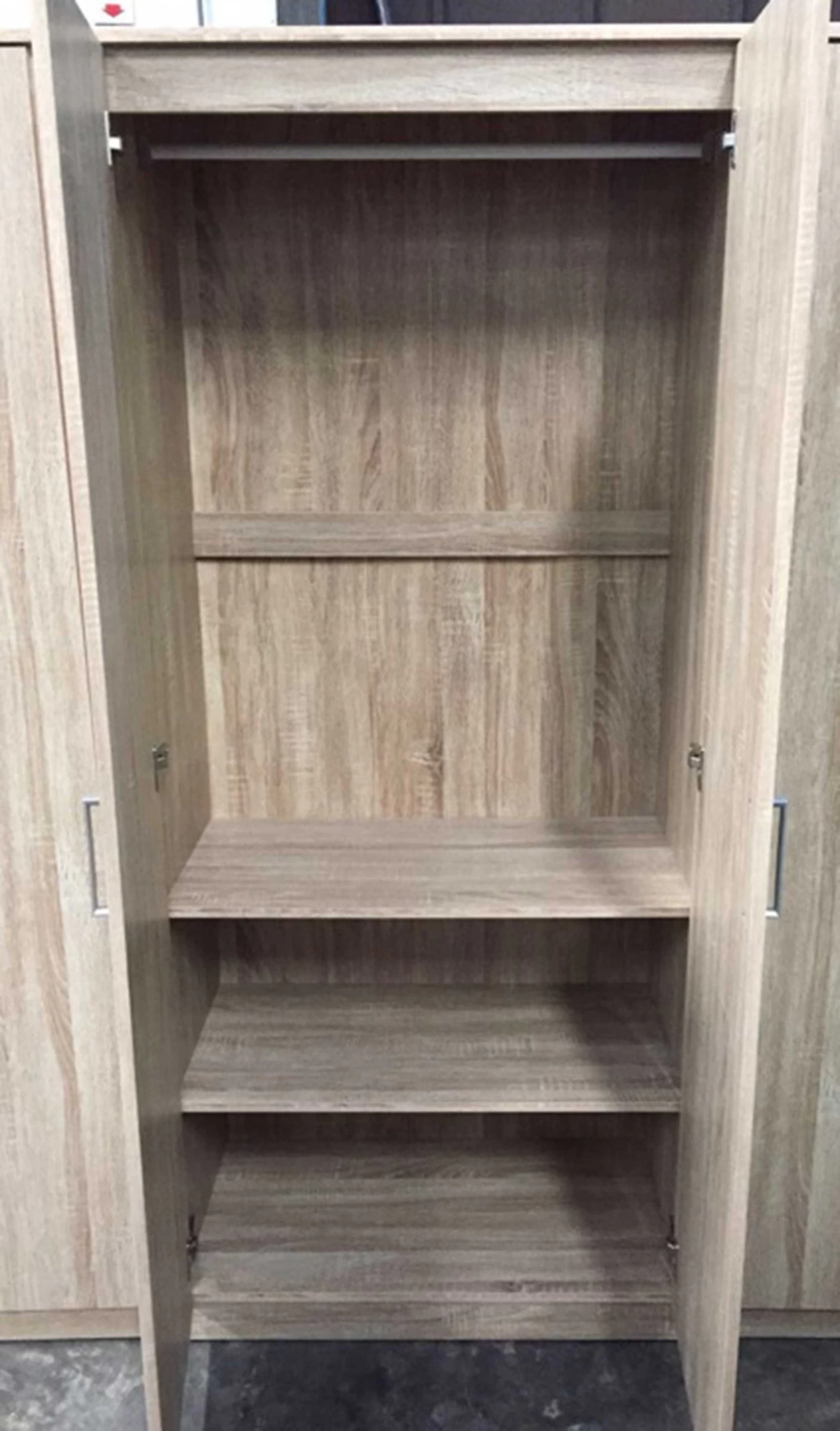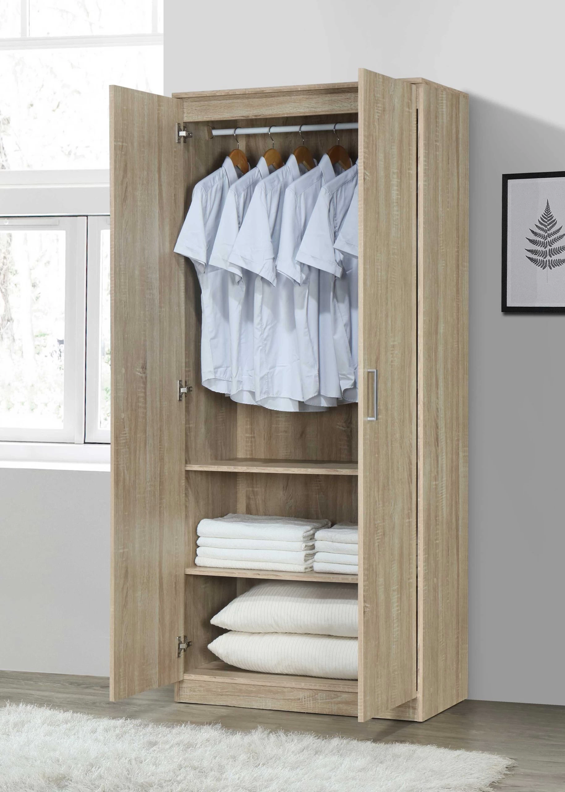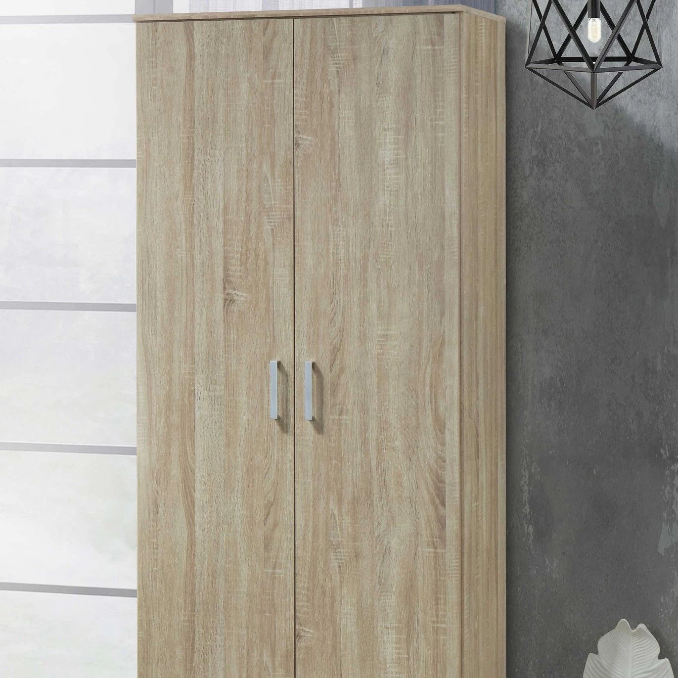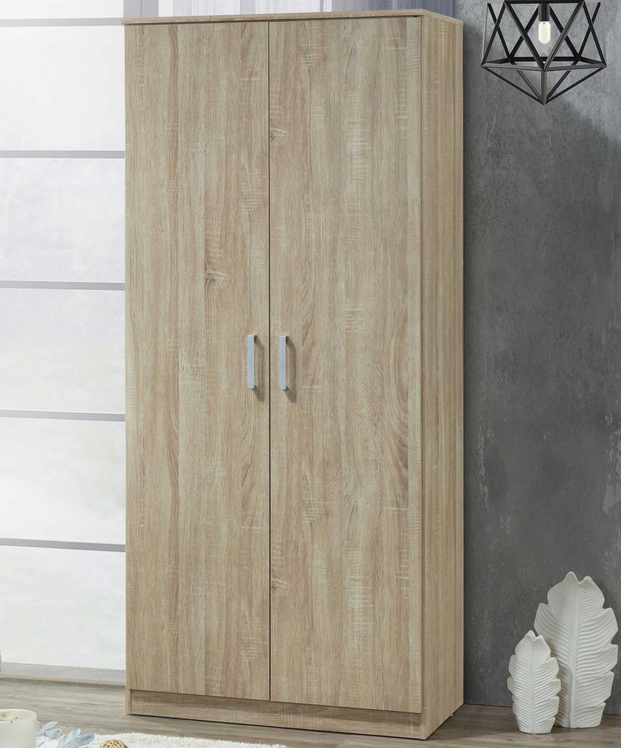 Kledingkast Lias met 2 deuren is gemaakt uit spaanplaat met een sonoma eikdecor en grijze handvaten.