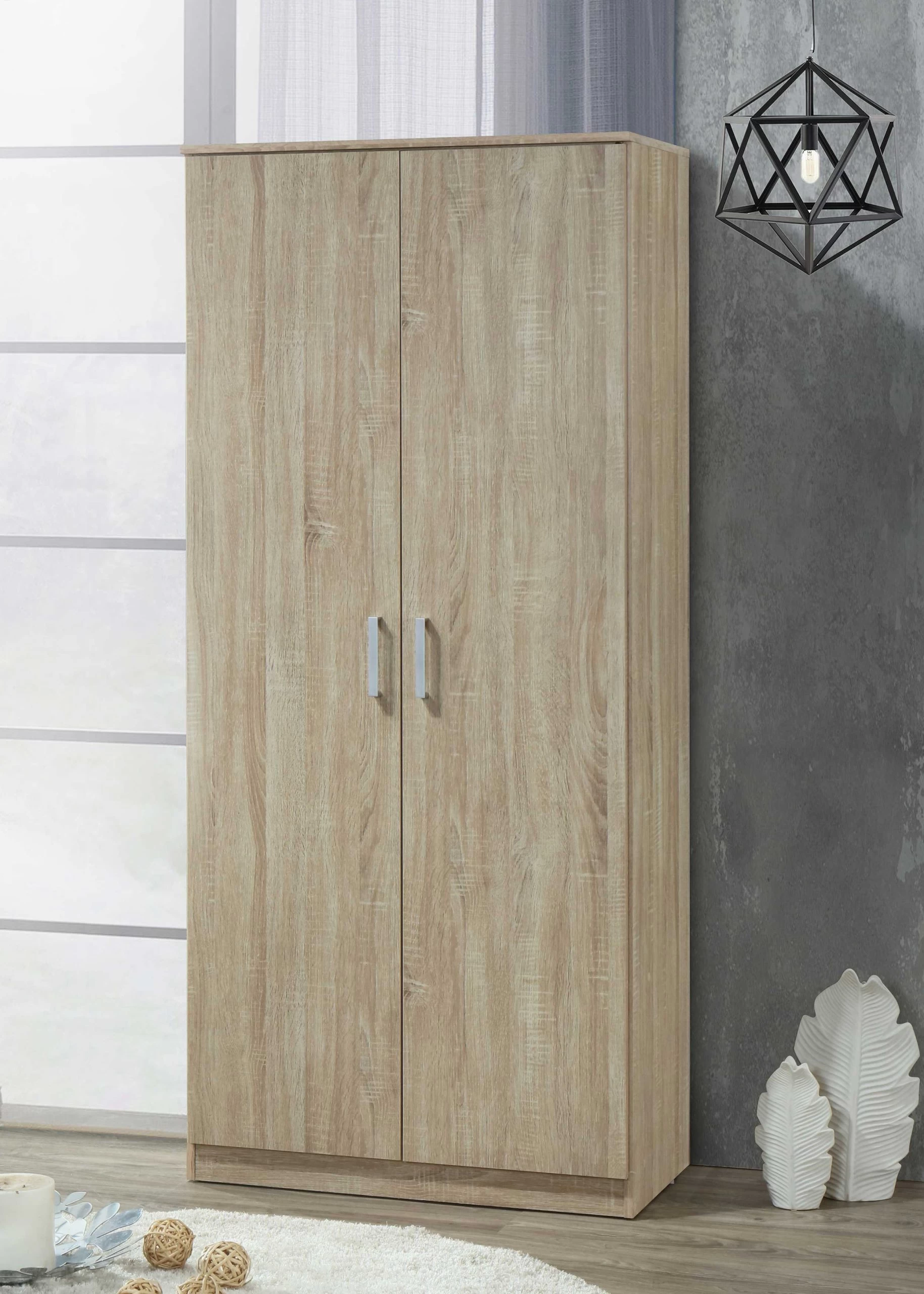 Nog op zoek naar een kast voor wat extra opbergruimte in huis? Deze Lias kledingkast met twee deuren telt twee legplanken en een kledingroede. De kast is gemaakt uit spaanplaat met een modern sonoma eikdecor en heeft twee grijze handvaten in kunststof.
