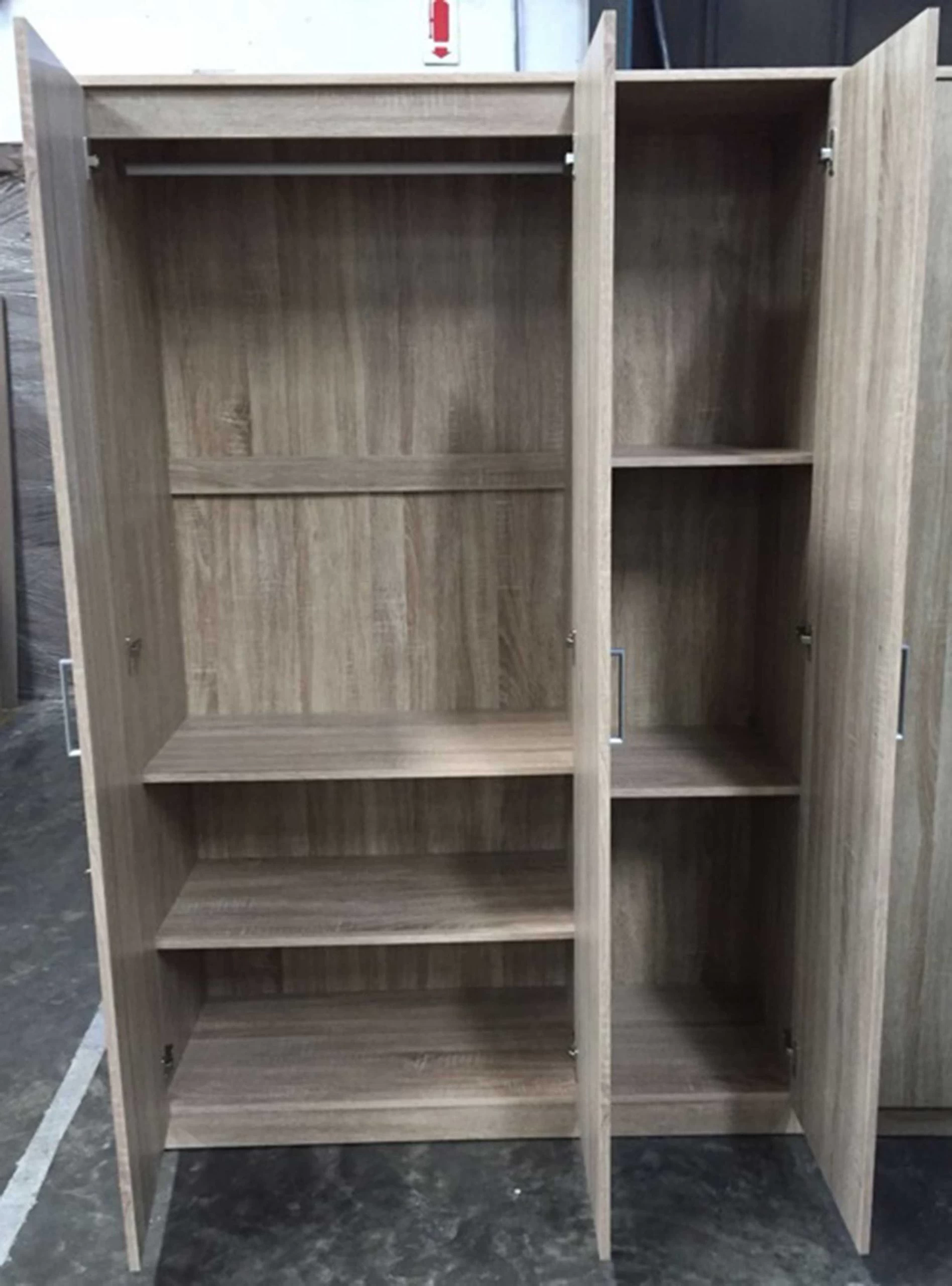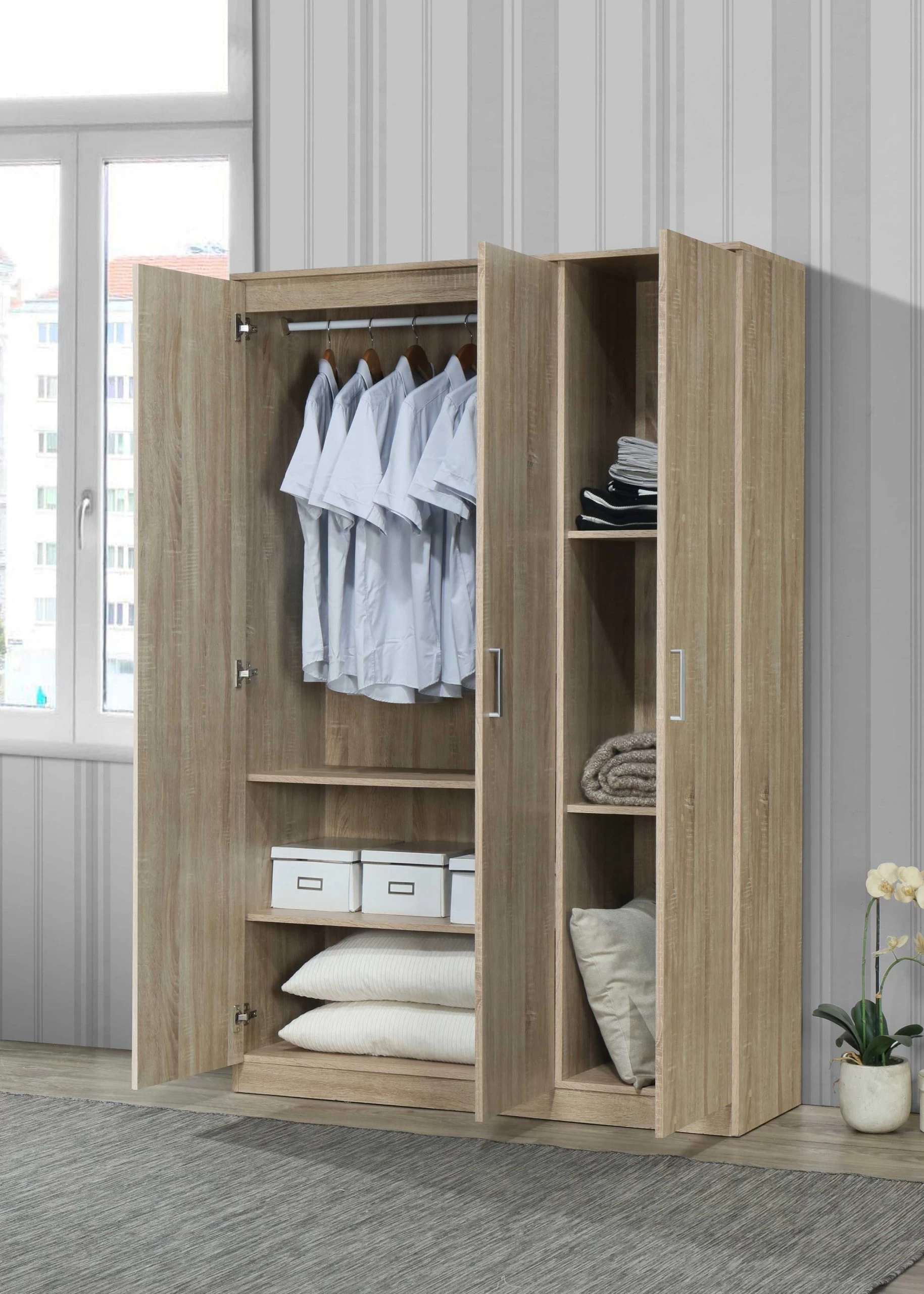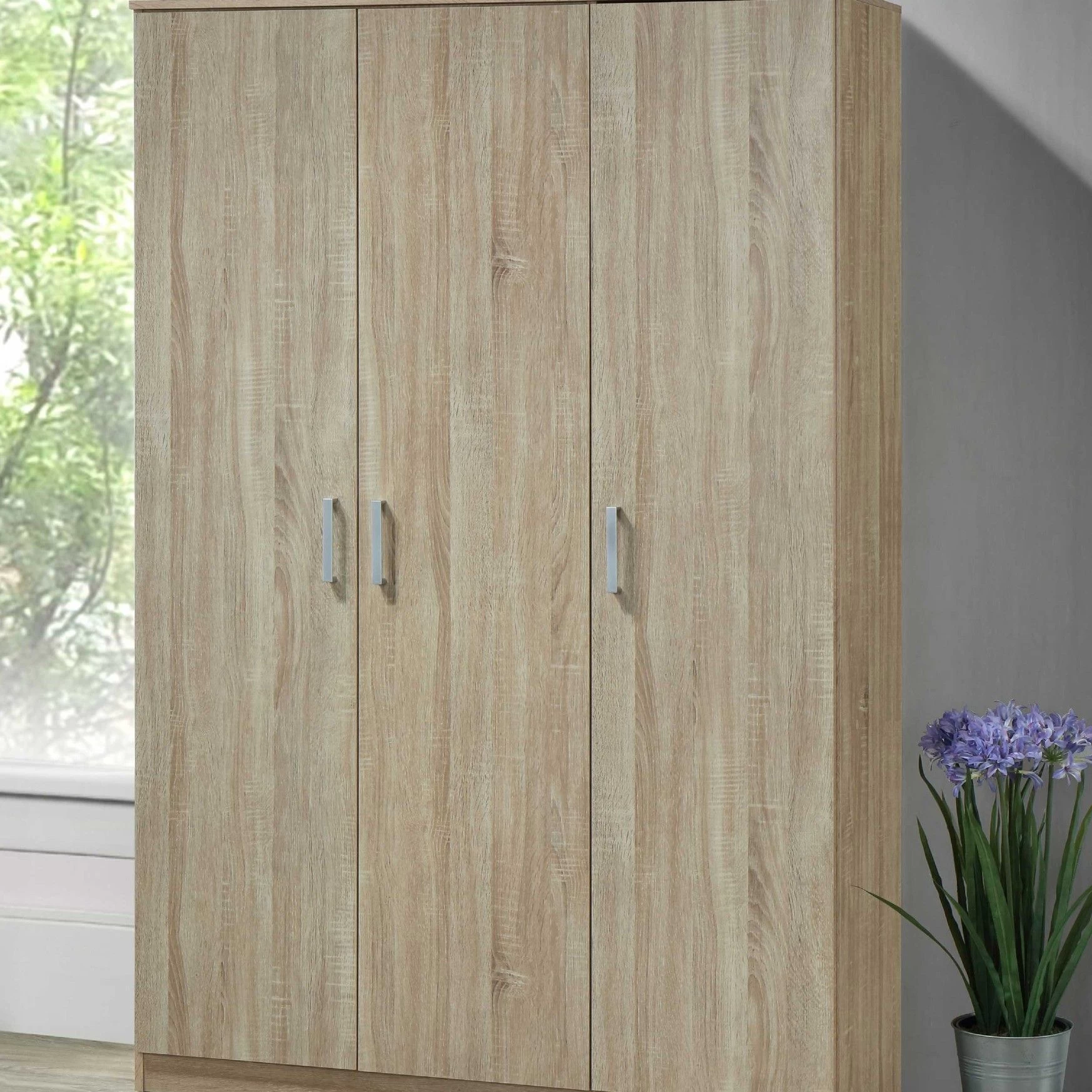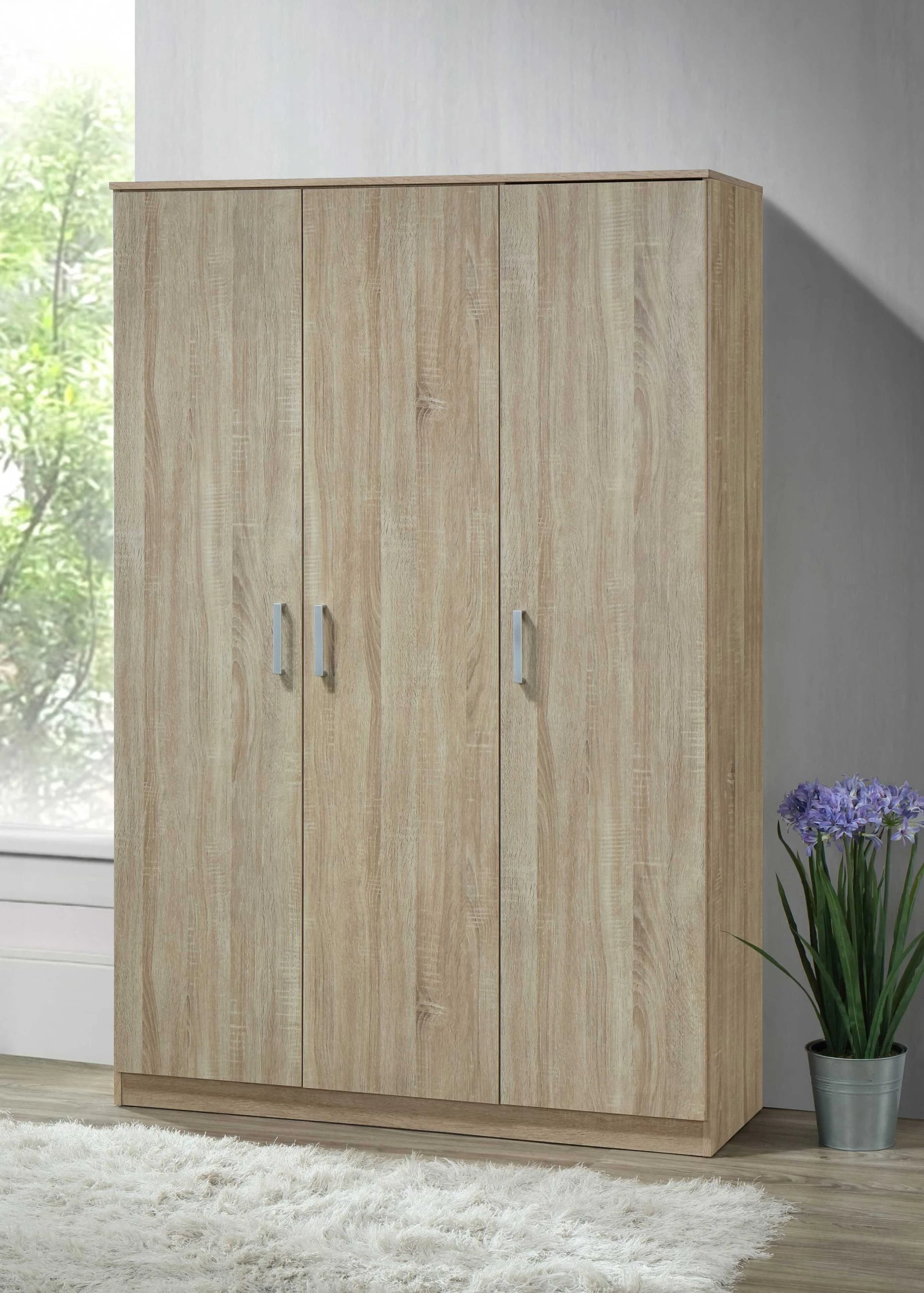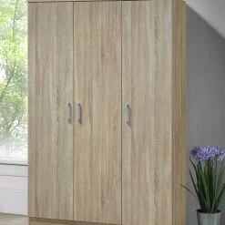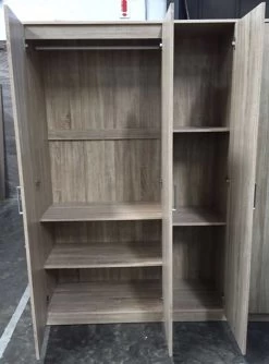 Nog op zoek naar een kast voor wat extra opbergruimte in huis? Deze Lias kledingkast met drie deuren telt vier legplanken en een kledingroede. De kast is gemaakt uit spaanplaat met een modern sonoma eikdecor en heeft drie grijze handvaten in kunststof.