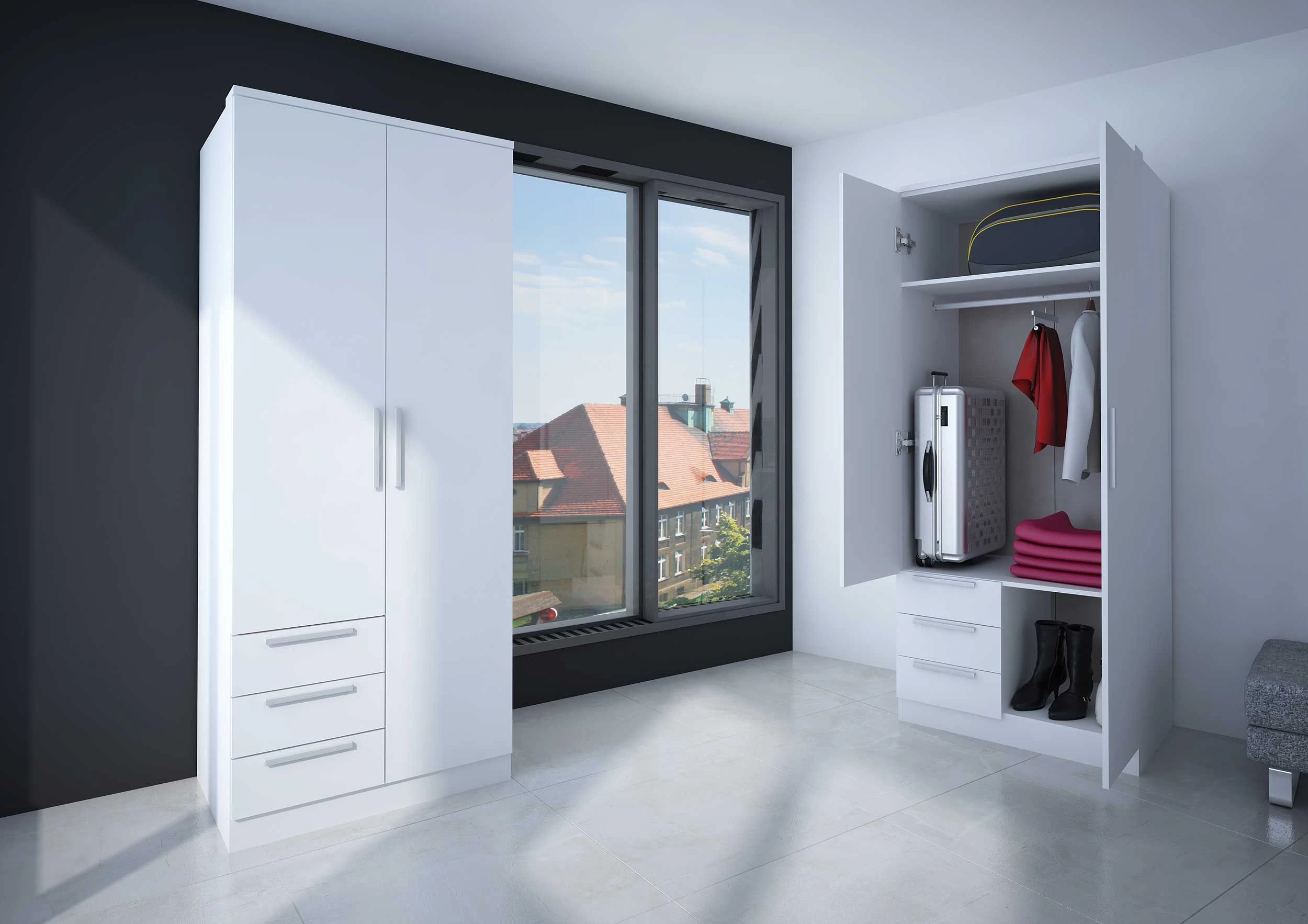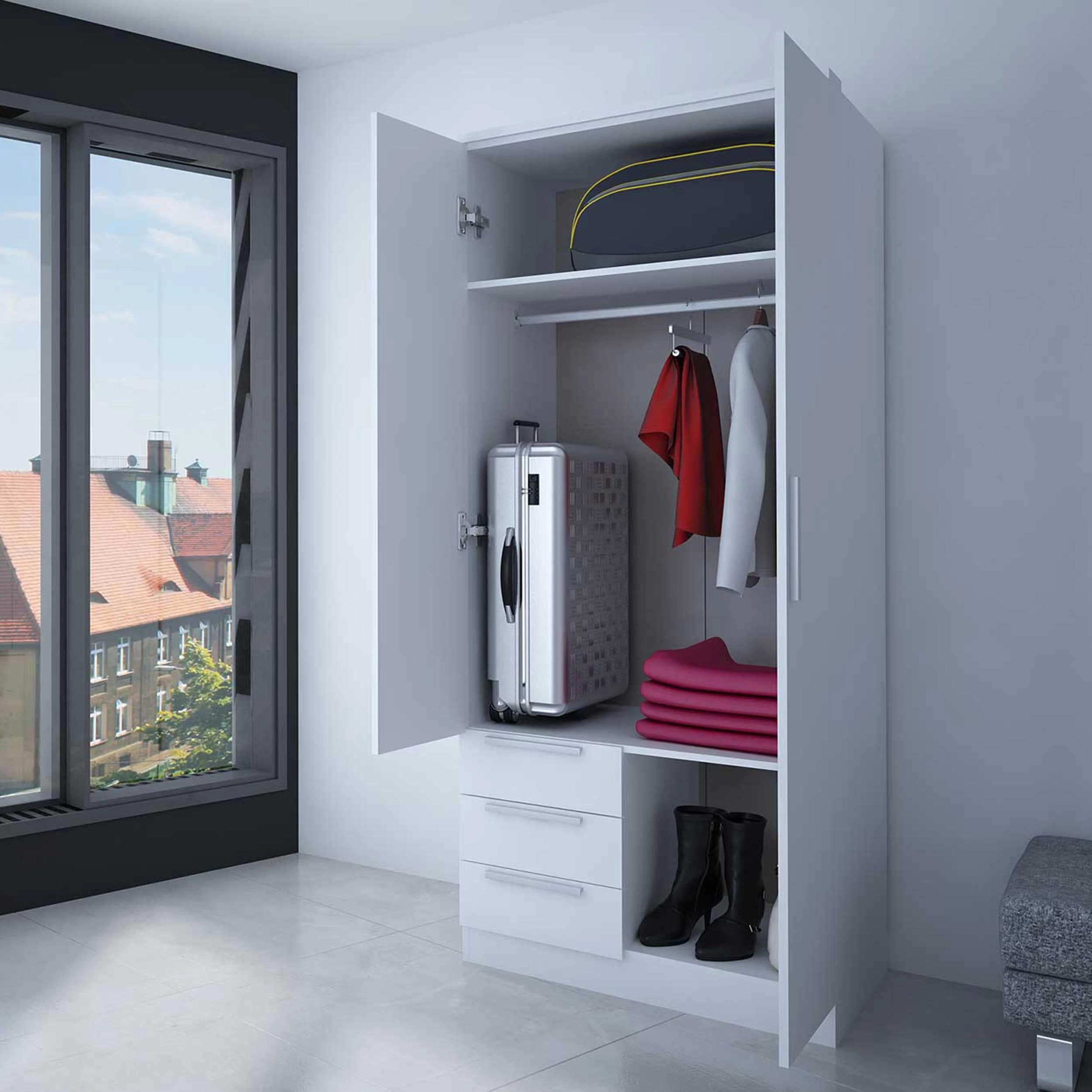 De kledingkasten van de Ramos-collectie integreren zich dankzij hun neutrale design in elke slaapkamer. Deze witte 2-deurskledingkast biedt jou heel wat ruimte om jouw kleren netjes op te bergen. De kast beschikt over een kledingroede, 2 ruime legplanken en 3 laden waarin je heel wat accessoires kan opbergen. Om optimaal gebruik te maken van jouw opbergoplossing, kan je deze kledingkast ook nog combineren met een opzetstuk van dezelfde collectie zodat je nog meer kleding kwijt kan.