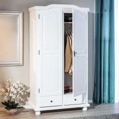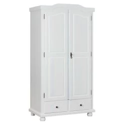 Deze witte kast met landelijke uitstraling biedt je de nodige ruimte om al je kledij en accessoires netjes op te bergen. Binnenin vind je 5 opbergvakken en een kledingroede. Als finishing touch beschik je ook over 2 handige lades, waarin je kleinere spullen een plekje kan geven. De kast is vervaardigd uit wit gelakt massief dennenhout.