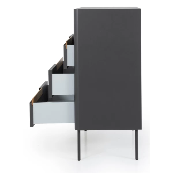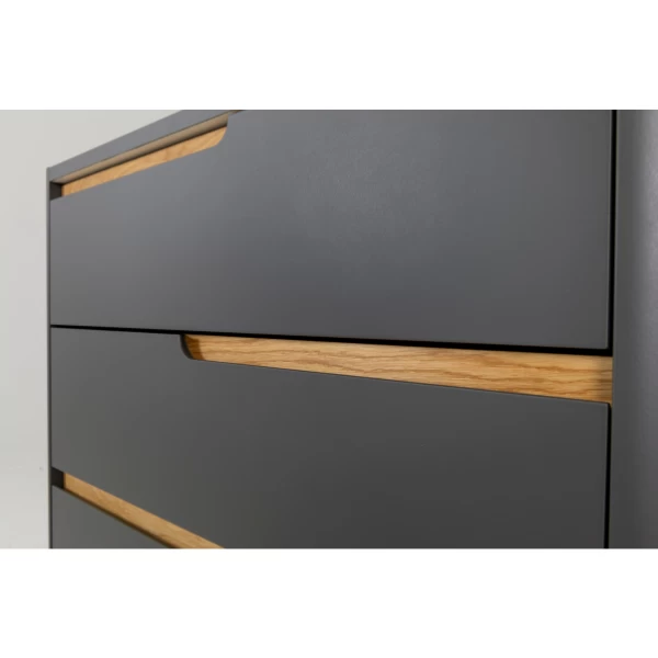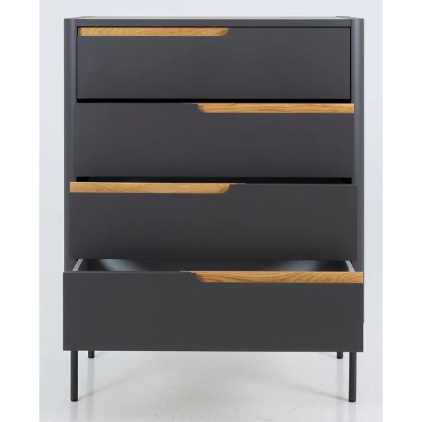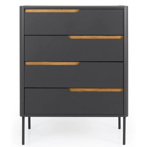 Deze moderne ladekast is uitgerust met 4 lades. Ze biedt veel opslagruimte en is daarom uitermate geschikt voor in de hal, de slaapkamer of de inloopkast. Waar kasten er soms log uit kunnen zien, is dat door de afgeronde hoeken en de slanke, metalen poten bij deze kast niet het geval. Een ander voordeel van deze kast is dat de lades met een softclose-systeem zijn uitgerust, waardoor je andere mensen in huis niet wakker maakt, wanneer je je kleren pakt. De boven- en onderkant van deze ladekast zijn gemaakt uit spaanplaat, de zijkanten uit MDF en de poten uit metaal. Het geheel is afgewerkt met eikenhouten details.