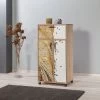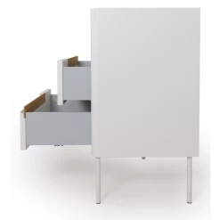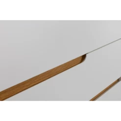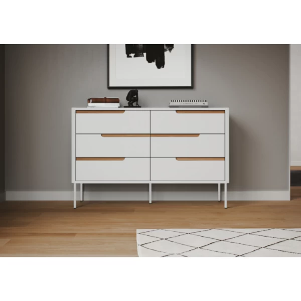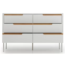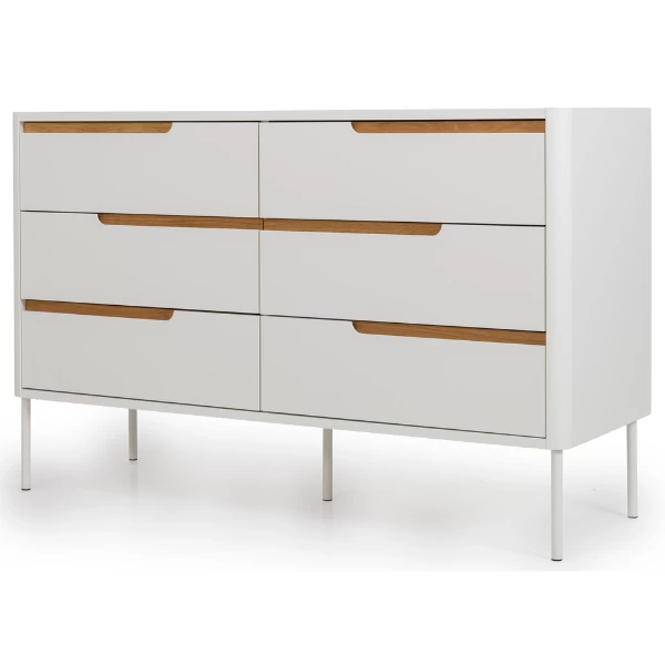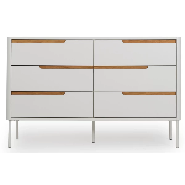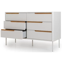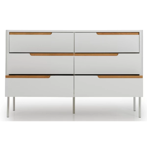 Deze moderne ladekast is uitgerust metย 6 lades. Ze biedt veel opslagruimte en is daarom uitermate geschikt voor in de hal, de slaapkamer of de inloopkast. Waar kasten er soms log uit kunnen zien, is dat door de afgeronde hoeken en de slanke, metalen poten bij deze kast niet het geval. Een ander voordeel van deze kast is dat de lades met een softclose-systeem zijn uitgerust, waardoor je andere mensen in huis niet wakker maakt, wanneer je je kleren pakt. De boven- en onderkant van deze ladekast zijn gemaakt uitย spaanplaat, de zijkanten uitย MDFย en de poten uit metaal. Het geheel is afgewerkt met eikenhouten details.