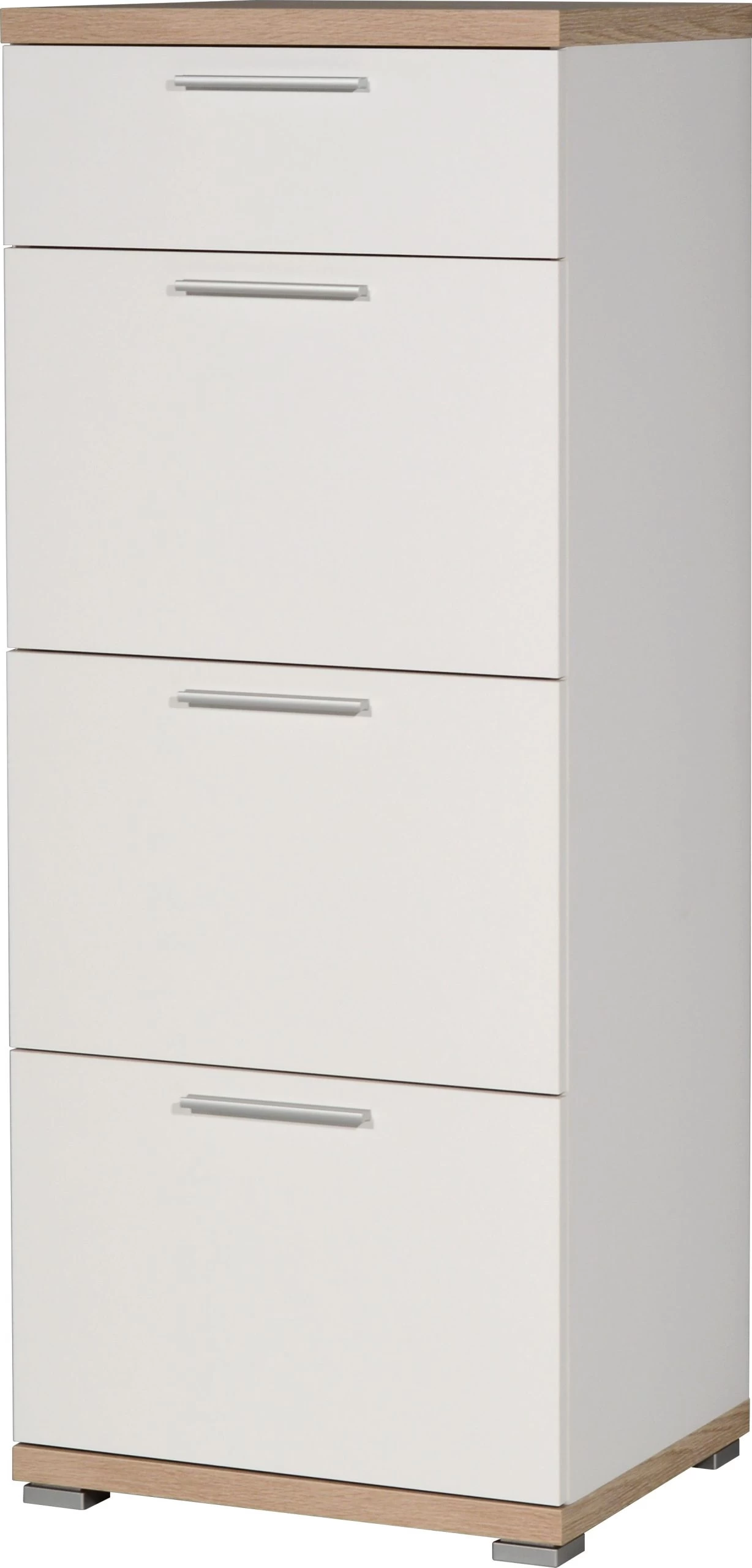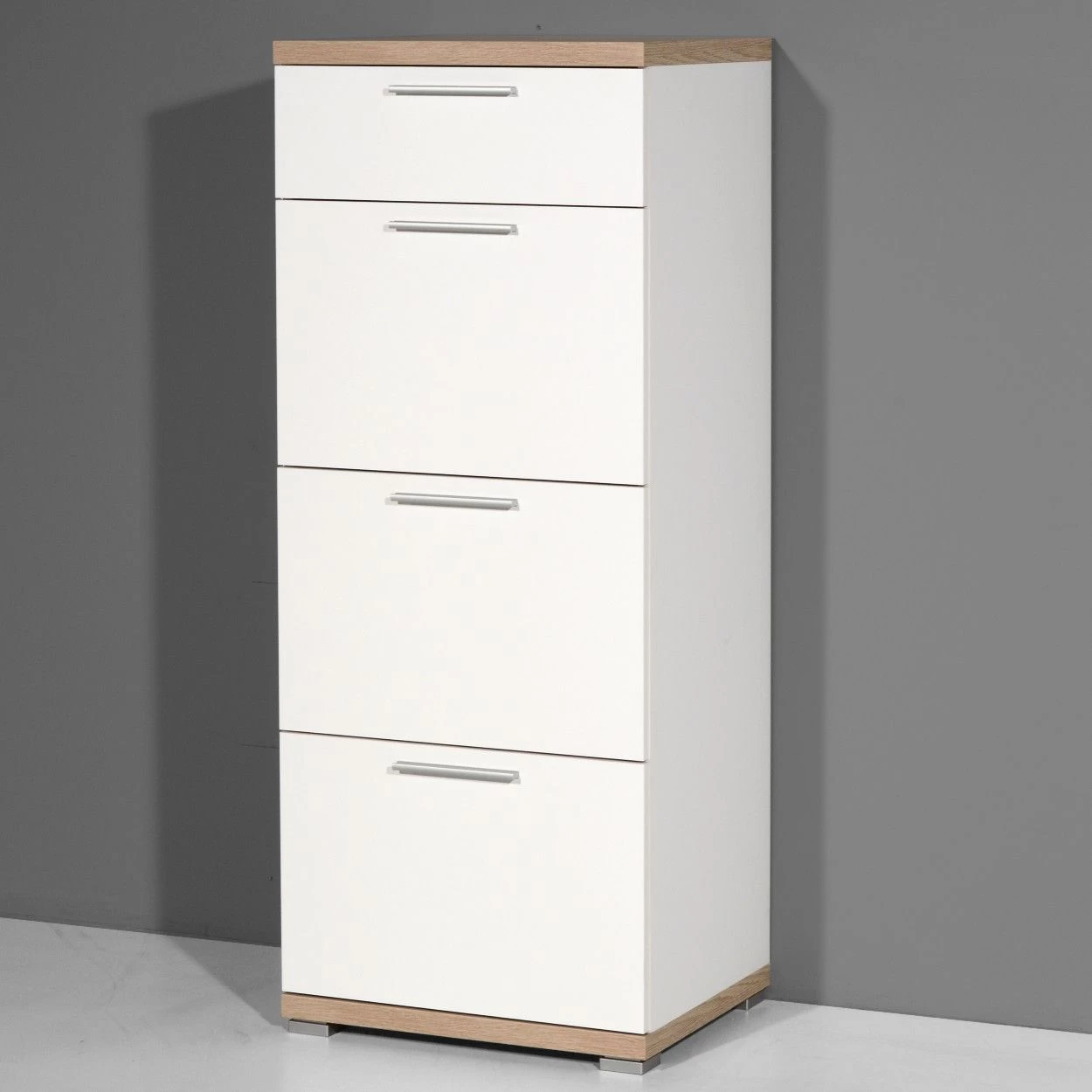 Met de witte Tosun-ladekast met accenten in eikdecor van de Duitse meubelfabrikant Germania schep je een moderne, maar natuurlijke look in je woonkamer. De ladekast uit spaanplaat is robuust en toch compact, aangezien het meubel slechts 48 cm breed is. De kast kenmerkt zich naast een trendy design bovendien door een uiterst functionele indeling, aangezien er naast drie grote lades ook één kleinere lade is voorzien. Daardoor kan je zowel kleine accessoires als iets grotere spullen in het meubel kwijt. De lades zijn uitgerust met metalen handgrepen. Het innovatieve “touchwood”-oppervlak geeft de houtlook en het cachet waar jij naar op zoek bent!