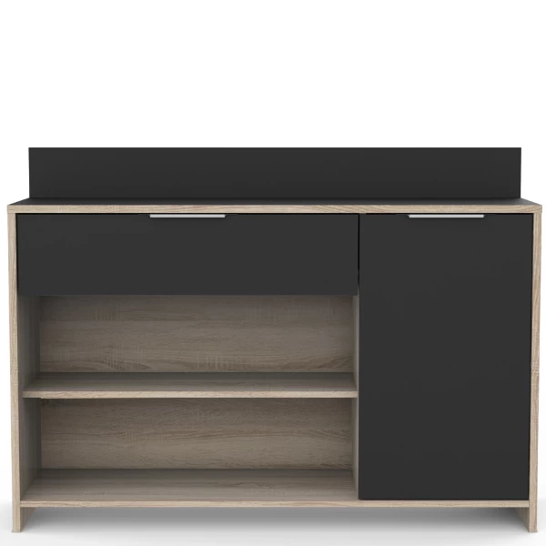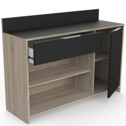 Microgolfkast Michael is gemaakt uit gemelamineerde spaanplaat in matzwart en ruwe eikdecor. De kast bestaat uit 1 lade, 1 draaideur, 1 legplank en 2 open vakken.