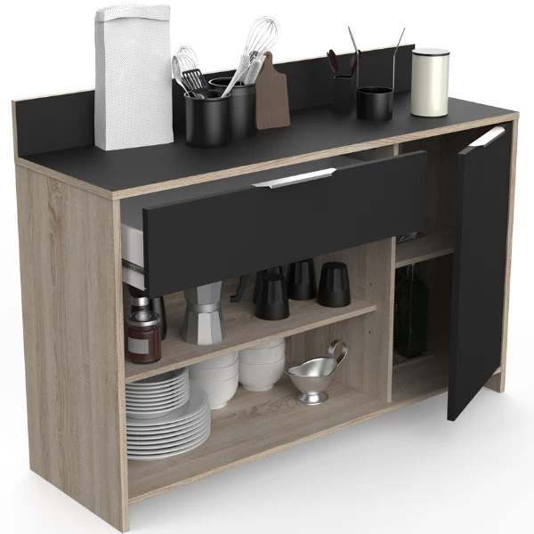 De combinatie tussen het ruwe eikdecor en het strakke matzwart maken van deze microgolfkast de perfecte aanvulling voor uw industriële keuken. De kast bestaat uit een ruime lade voor uw bestek, 2 open vakken waarin u een microgolfoven en allerlei keukengerei kunt plaatsen en een draaideur met daarachter een legplank voor het wegbergen van borden, tassen, glazen, kruiden, voorraad, noem maar op. Op het werkblad is plaats voor het snijden van groenten en de spatwand beschermt uw muren tegen vlekken. Schroeven en pluggen voor wandmontage niet inbegrepen.
