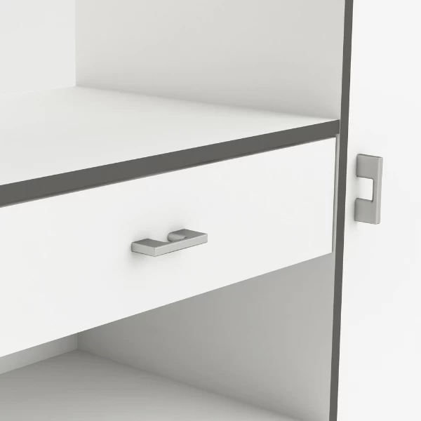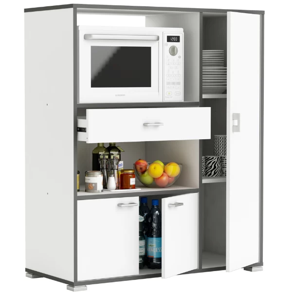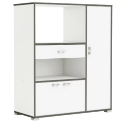 Deze microgolfkast past door zijn moderne en neutrale ontwerp in bijna elk interieur. Deze kast biedt u een lade voor uw bestek, een draaideur met daarachter 2 legplanken voor uw borden, tassen en glazen, 2 draaideuren met daarachter ruimte voor wat voorraad en 2 open vakken waarvan 1 voor uw microgolfoven en 1 voor uw kleine keukenapparaten, kruiden, enz. Met microgolfkast Zira heeft u altijd een opgeruimde keuken!