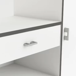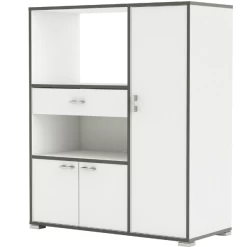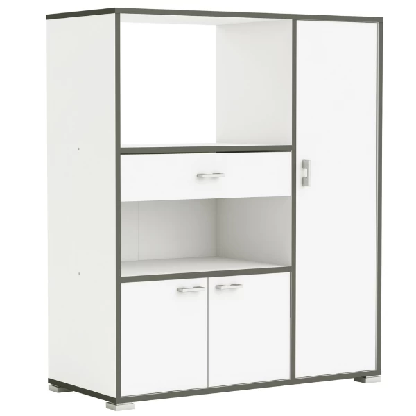 Microgolfkast Zira is gemaakt uit gemelamineerde spaanplaat in mat wit. De kast bestaat uit 2 open vakken, een lade, 3 draaideuren en 2 legplanken.