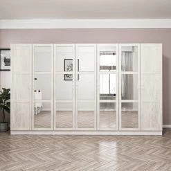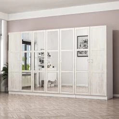 Met een breedte van 315 cm, een hoogte van 190 cm en een diepte van 52 cm biedt deze ruime kast voldoende opbergruimte voor al je kleding. Hij is voorzien van talloze legplanken, zodat je je kleding, schoenen en accessoires efficiënt kunt ordenen.