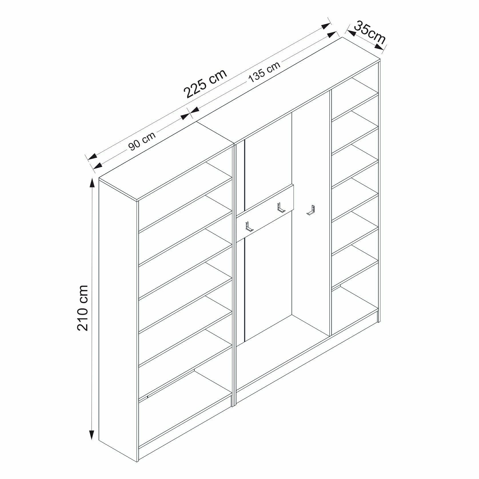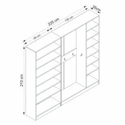 Met een breedte van 225 cm, een hoogte van 210 cm en een diepte van 35 cm biedt deze kapstok voldoende opbergruimte voor je jassen, hoeden, tassen en meer. De walnootkleur voegt een vleugje elegantie en verfijning toe aan elke hal of entree.