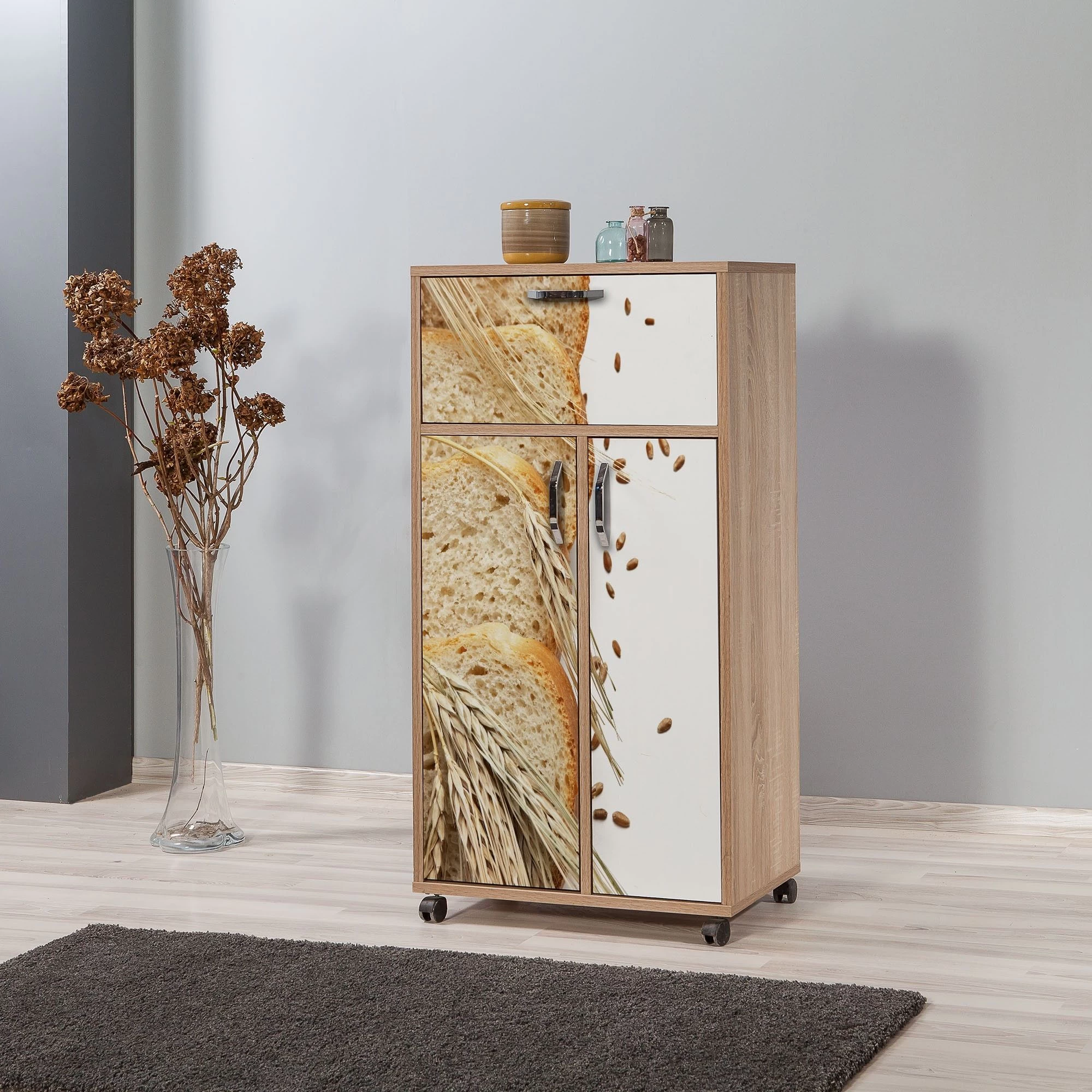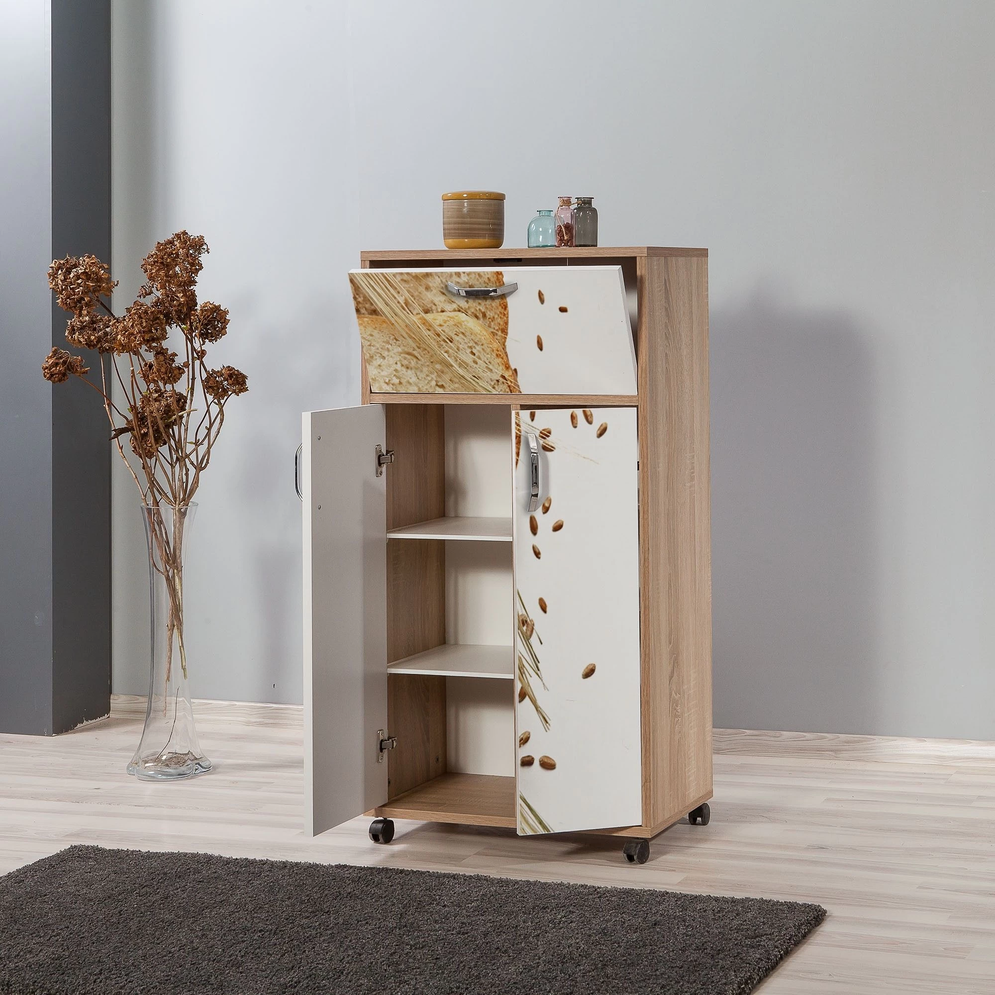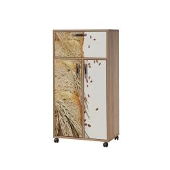 Vella multifunctionele kast is een 100% gemelamineerde spaanplaat met rollende poten en UV-coating. Hij heeft een breedte van 60 cm, een hoogte van 116 cm en een diepte van 36 cm. De kast heeft verschillende legplanken met een hoogte van 26 cm en kan aan de muur bevestigd worden. Verkrijgbaar in Sonoma Eik kleur